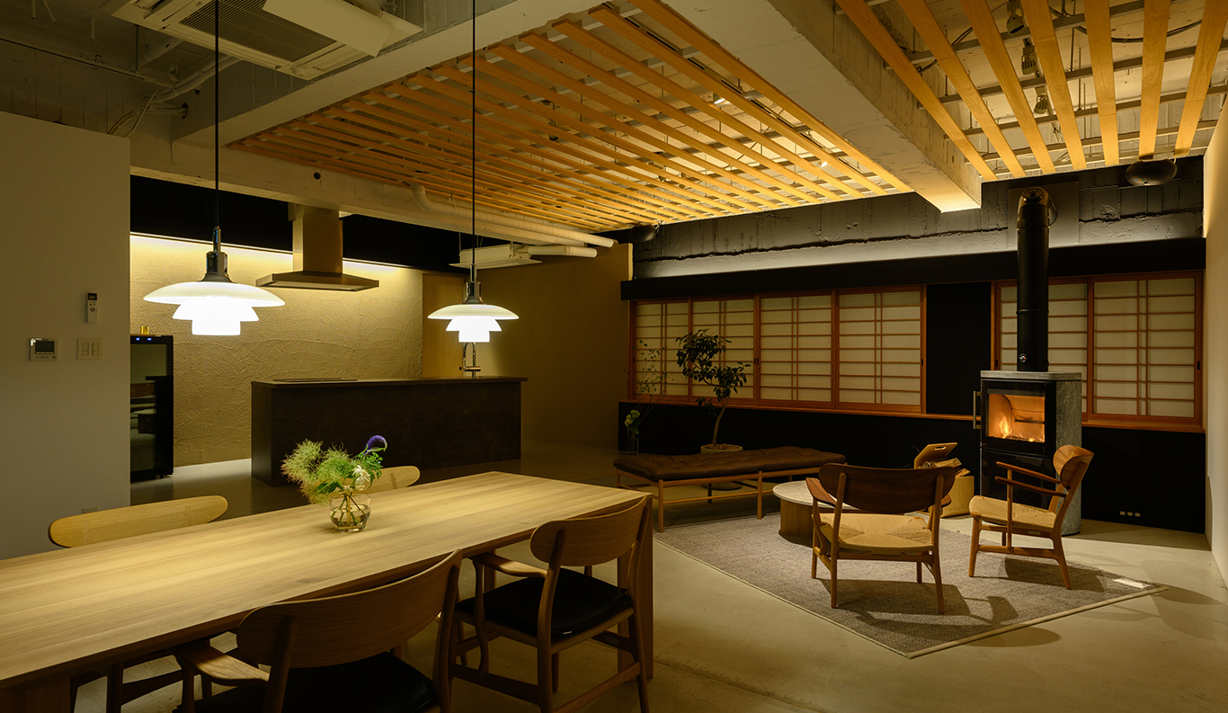Living and Dining The heart of ANABUKI TEI is the sprawling open-plan living, dining, and kitchen space, centered around a classic wood-burning stove. It is filled with curved warm-wood Scandinavian furniture and fresh-cut flowers arranged by Anabuki-san’s wife, the natural materials mirroring the Japanese garden visible from floor-to-ceiling windows on the south wall. The kitchen, raised a step from the dining area, provides a stage for the private chefs to present their skills and serve course after course showcasing Shikoku’s rich culinary tradition. In between meals, the kitchen is stocked with complimentary drinks, fruit, and snacks from local makers, as well as a selection of international wines.