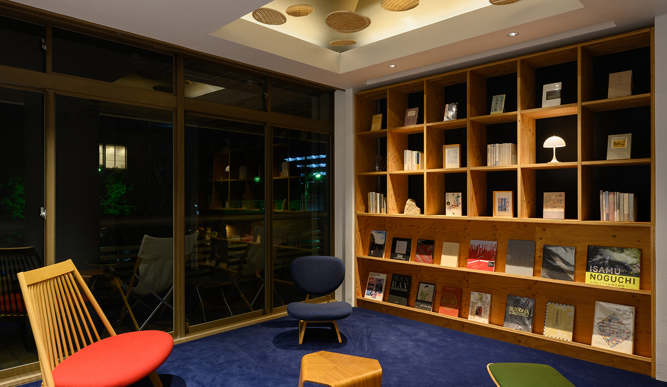 Library Amid the bedrooms of the second floor is a common area designated the library. As the name suggests, it is stocked with a collection of books focused on local art and culture, as well as low-slung chairs for casual perusing. The books share the shelves with artistic objets drawn from the same world: Kagawa’s traditional uchiwa fans, antique molds used to shape wagashi sweets, bookends carved from Aji granite. Beautiful as they are to look at, the real pleasure is hearing Anabuki-san share the stories behind each and how they connect to his family. Even the humble zaru, the woven bamboo strainer used at Japanese noodle shops, is elevated to art in this space, comprising an instillation on the ceiling that references Natsuji Anabuki’s passion for cold soba.