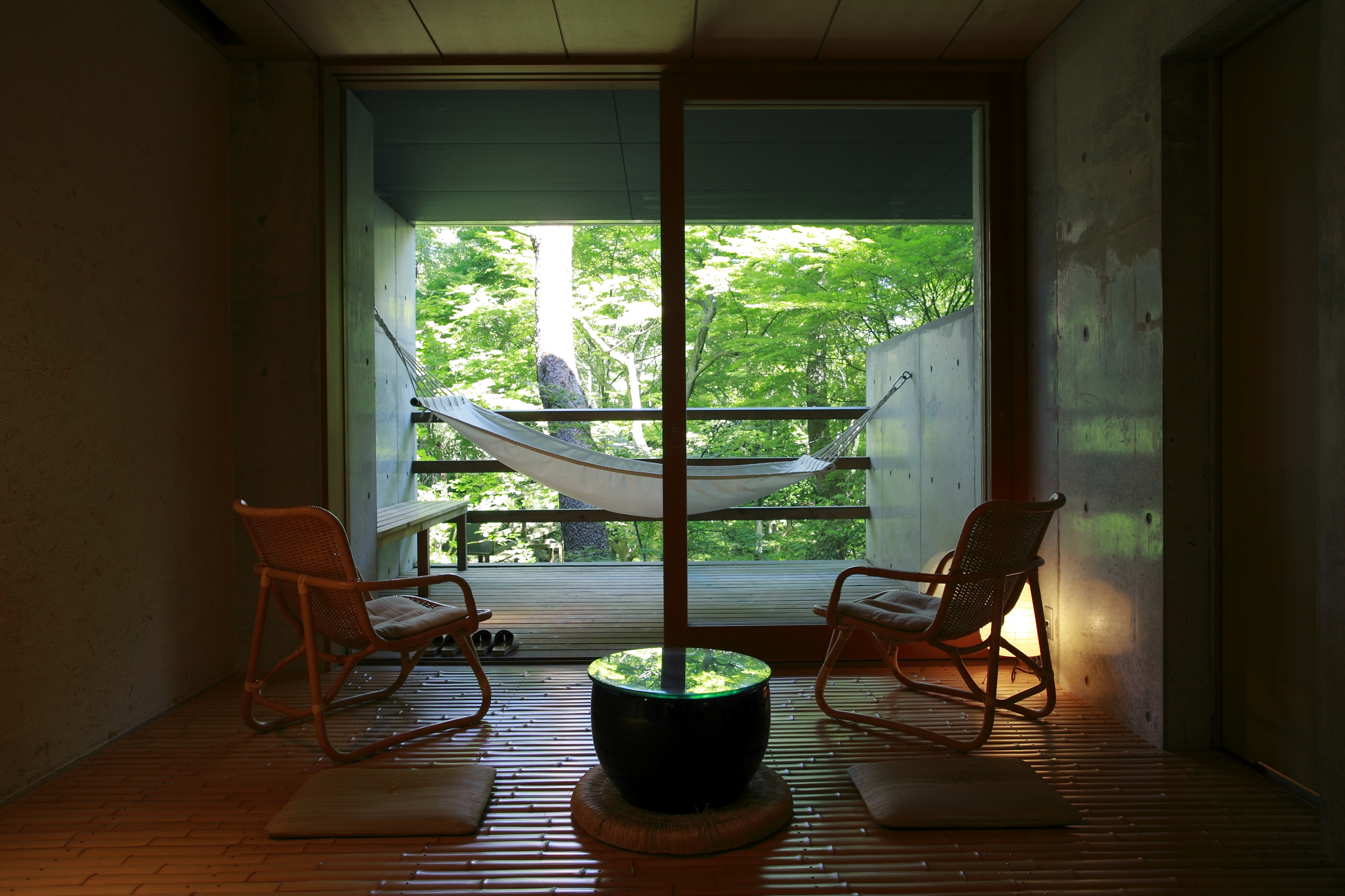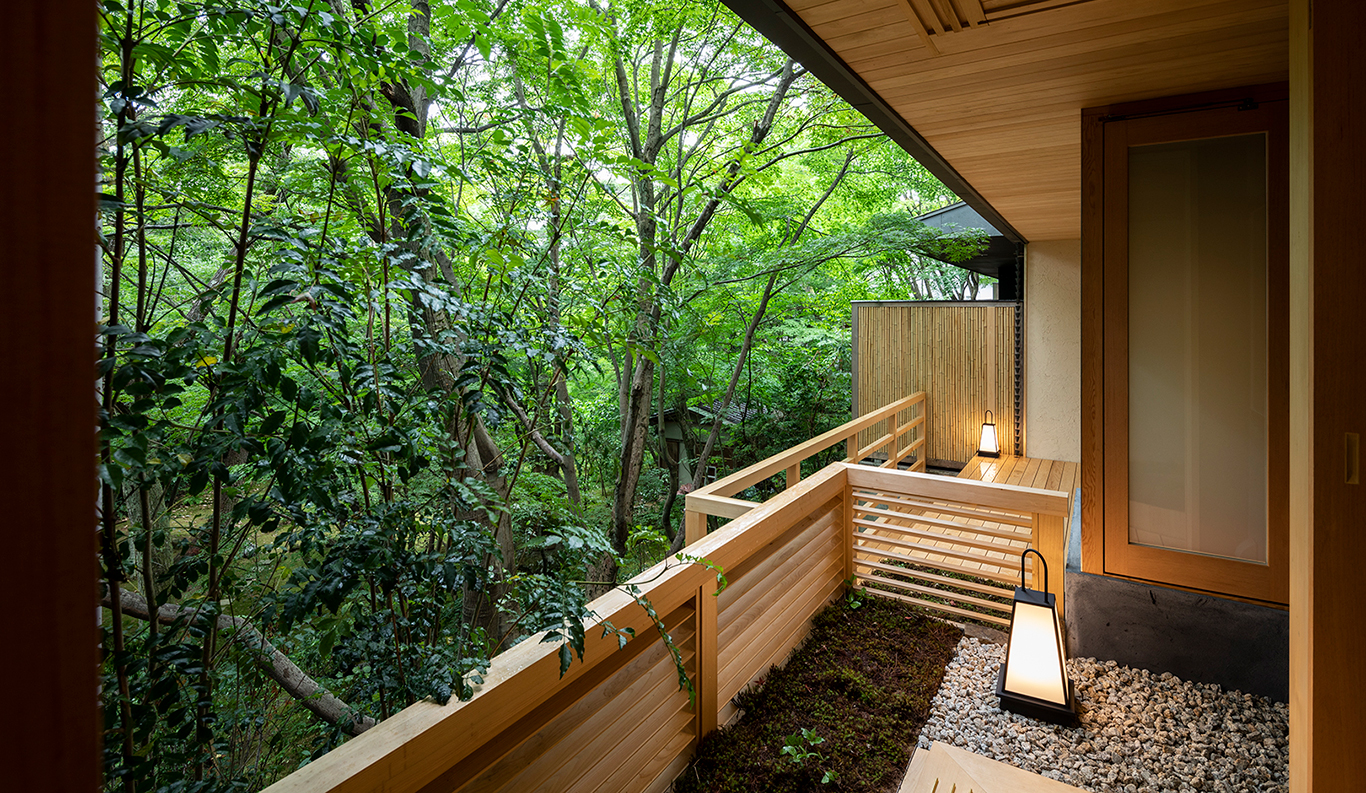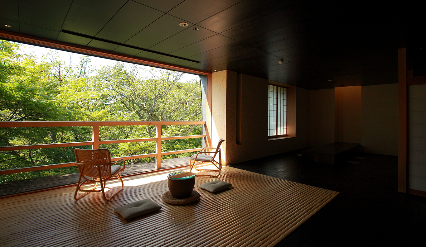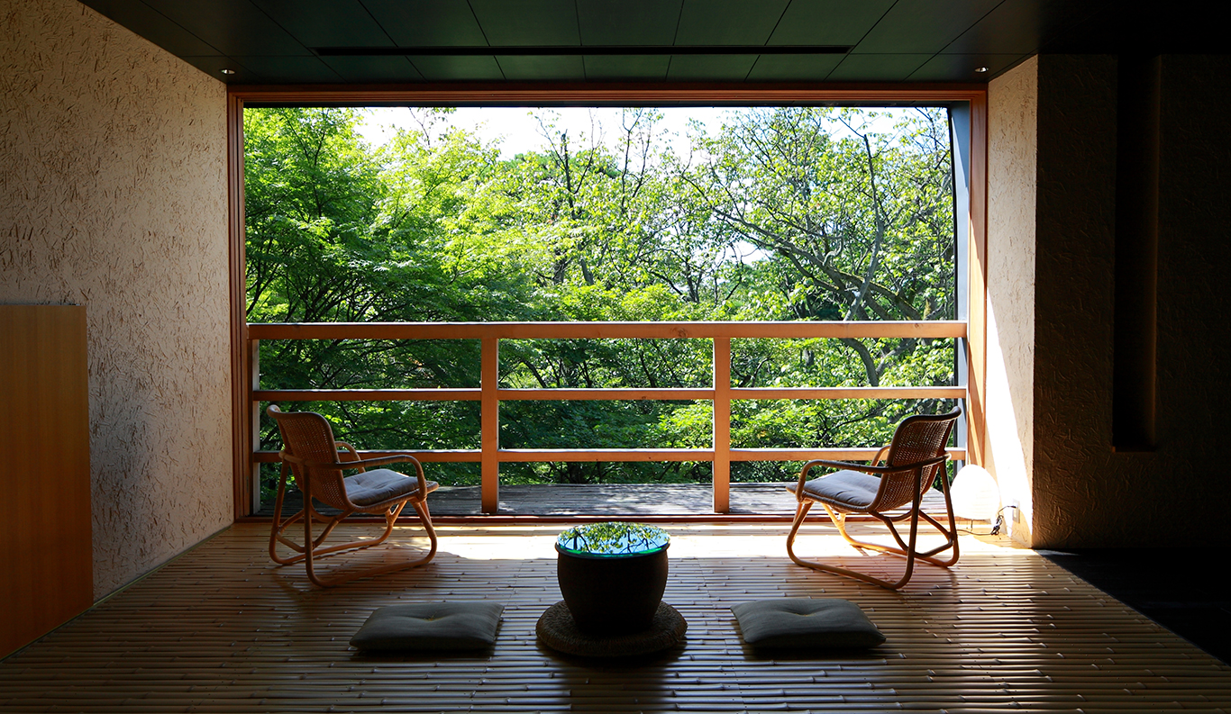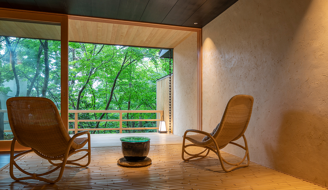 1-2 60 sqm Private Open-air Bath Bed These two rooms offer Western luxury overlooking the forest garden below and feature a terrace with skylights to enjoy moon viewing (otsukimi). Each room is equipped with a comfortable sofa for relaxing and a private outdoor hot spring bath.