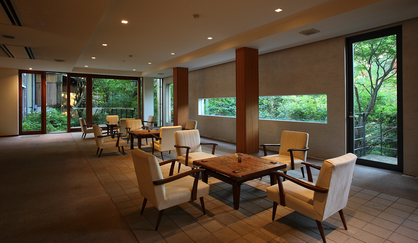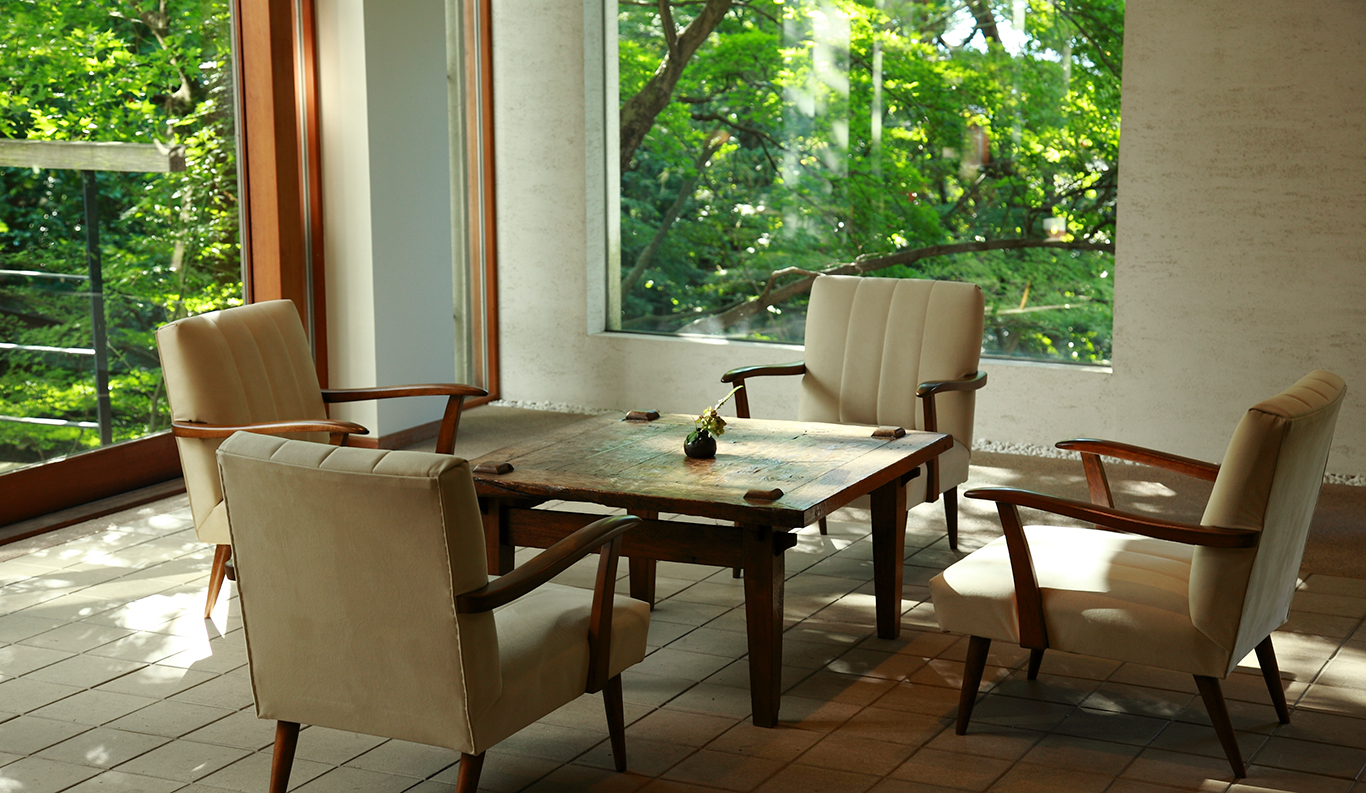 Lobby The ryokan's lobby is a common space where guests can relax, and new arrivals can shift into a Mukayu frame of mind. The space features elegant, Zen-inspired simplicity; horizontal and vertical windows give a perfect perspective on the play of nature outside in the garden. Staff at the reception desk are always ready to attend to guests' needs.
