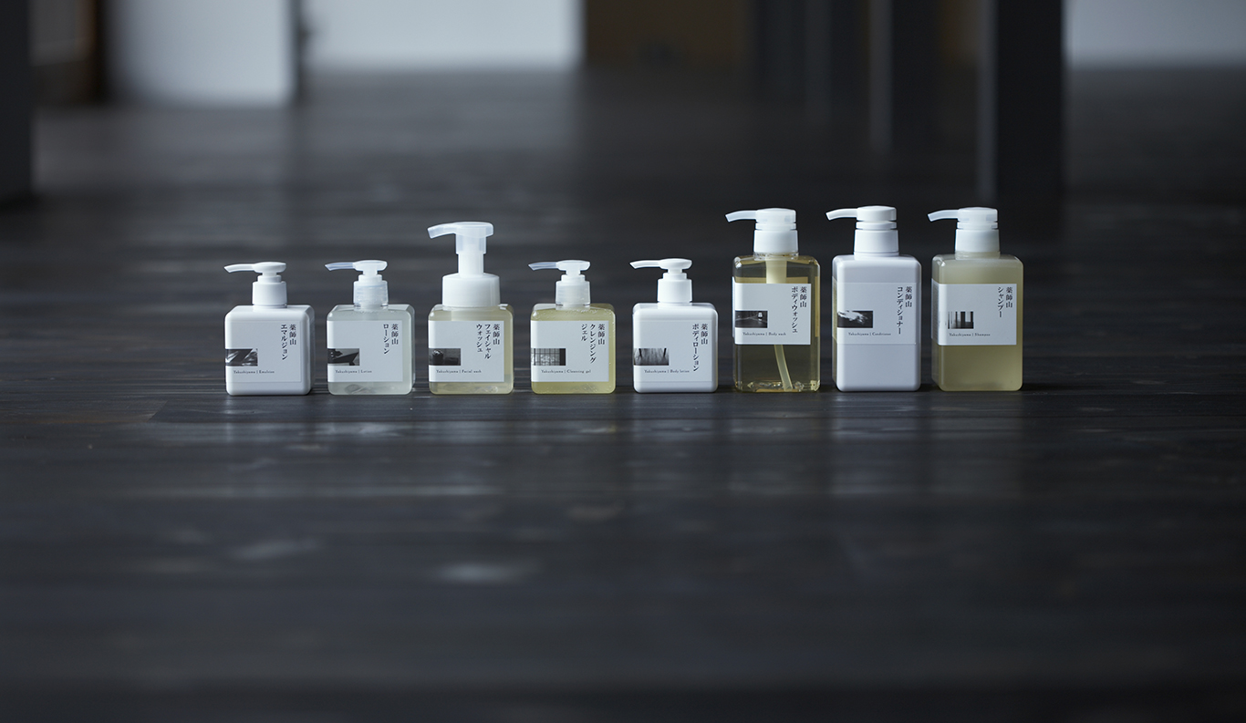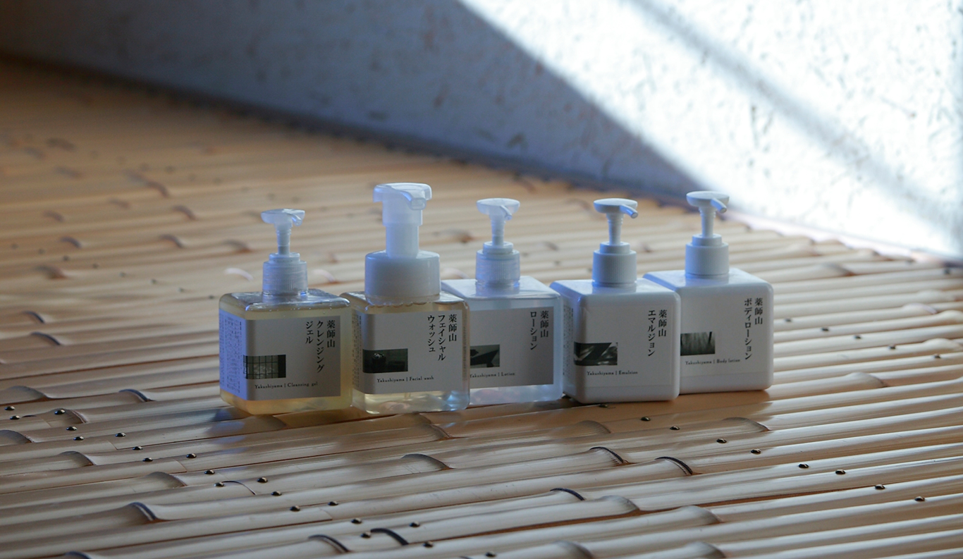 Yakushiyama amenities The Yakushiyama Amenities are a line of skincare products that combine natural ingredients with the latest cutting-edge skincare technologies. The amenities were designed by Mukayu’s proprietress Sachiko Nakamichi, and include shampoo, conditioner, body wash, body lotion, cleansing gel, facial wash, lotion, and emulsion. There is also a line of essential oils for use in aromatherapy. These products are unique to Mukayu. It took three years to develop them, incorporating the famous Yamashiro hot spring water and other natural ingredients. The Yakushiyama amenities are available in the rooms as well as in the communal baths, and the Spa Entei. They can also be purchased at the shop and on mukayu.com.
