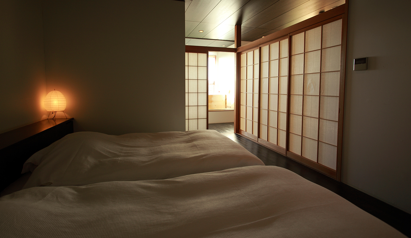 1-4 95 sqm Private Open-air Bath Bed Mukayu's Zen Executive suites offer the best of both styles of authentic Japanese style room and cozy Western style bedroom. The two full-size beds are soft and inviting, and the walk-in closet and luggage room help maintain the room’s clean, uncluttered lines.