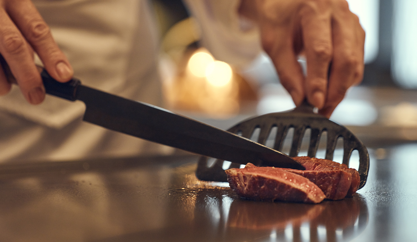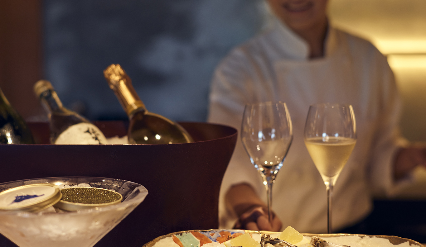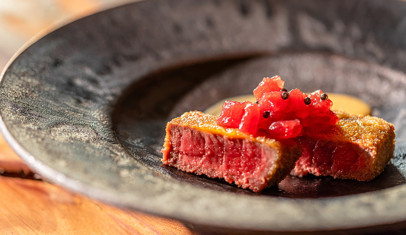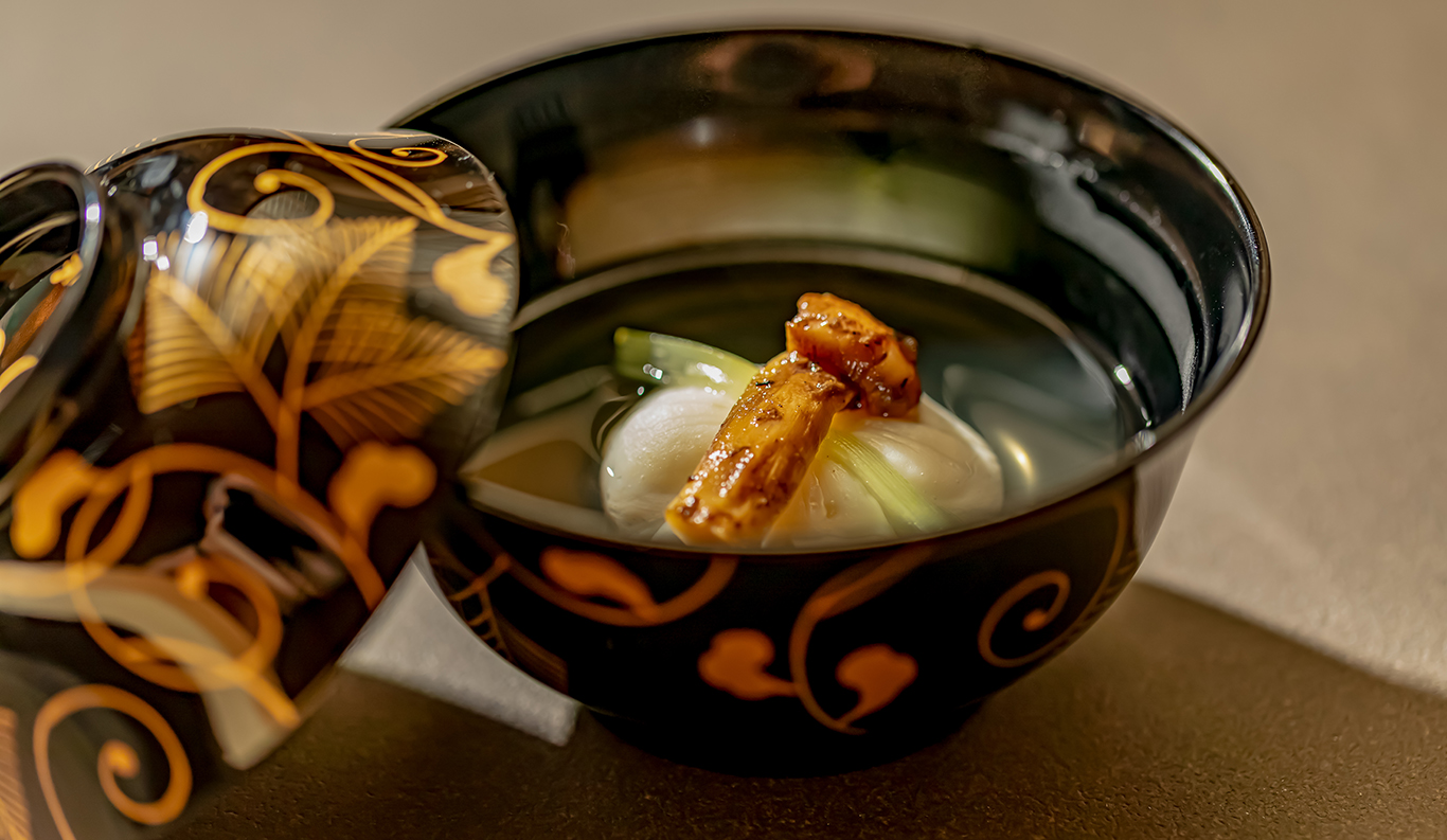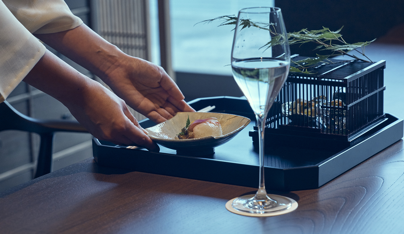 This deep dive into kaiseki culture begins with a welcome drink poured into a flat, lacquer dish called a sakazuki, an ancient style of sake cup used in formal celebrations. The kimono-clad Okami glides from table to table, greeting each guest by name. From the neighboring teppan, the aroma of sizzling wagyu sharpens hunger while the hum of conversation and the click and clack of chefs’ knives create an especially lively atmosphere. Then come endless courses of exquisitely executed kaiseki, the dishware chosen personally by the chef to represent the pride of Japan: elegant Arita ware embossed with gold, the brown and green of tea ceremony’s Oribe ware, glistening Kanazawa lacquerware dusted with silver maki-e. Classic presentations like steamed duck dumplings and gingko nuts in dashi lead to more contemporary ones like the signature maguro cutlet with caviar and mustard sauce before culminating in the grand reveal of the seasonal clay pot rice. Culture, nourishment, and luxurious pleasure, brought together in a single meal.