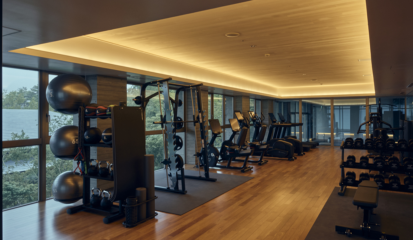A 20-meter infinity pool, heated year round, seems to extend into Mt. Fuji’s forelands, the peak reflected in the still waters. It is a place of serene relaxation, exclusive to ryokan guests, who can swim leisurely laps, soak tired muscles in the neighboring jacuzzi, nap in the plush daybeds, or steam in the mist sauna as the mood takes them. Next door is a fully equipped 24-hour gym with state-of-the-art fitness machines, free weights, kettlebells, and more, all positioned to enjoy floor-to-ceiling mountain views while strengthening body and mind.