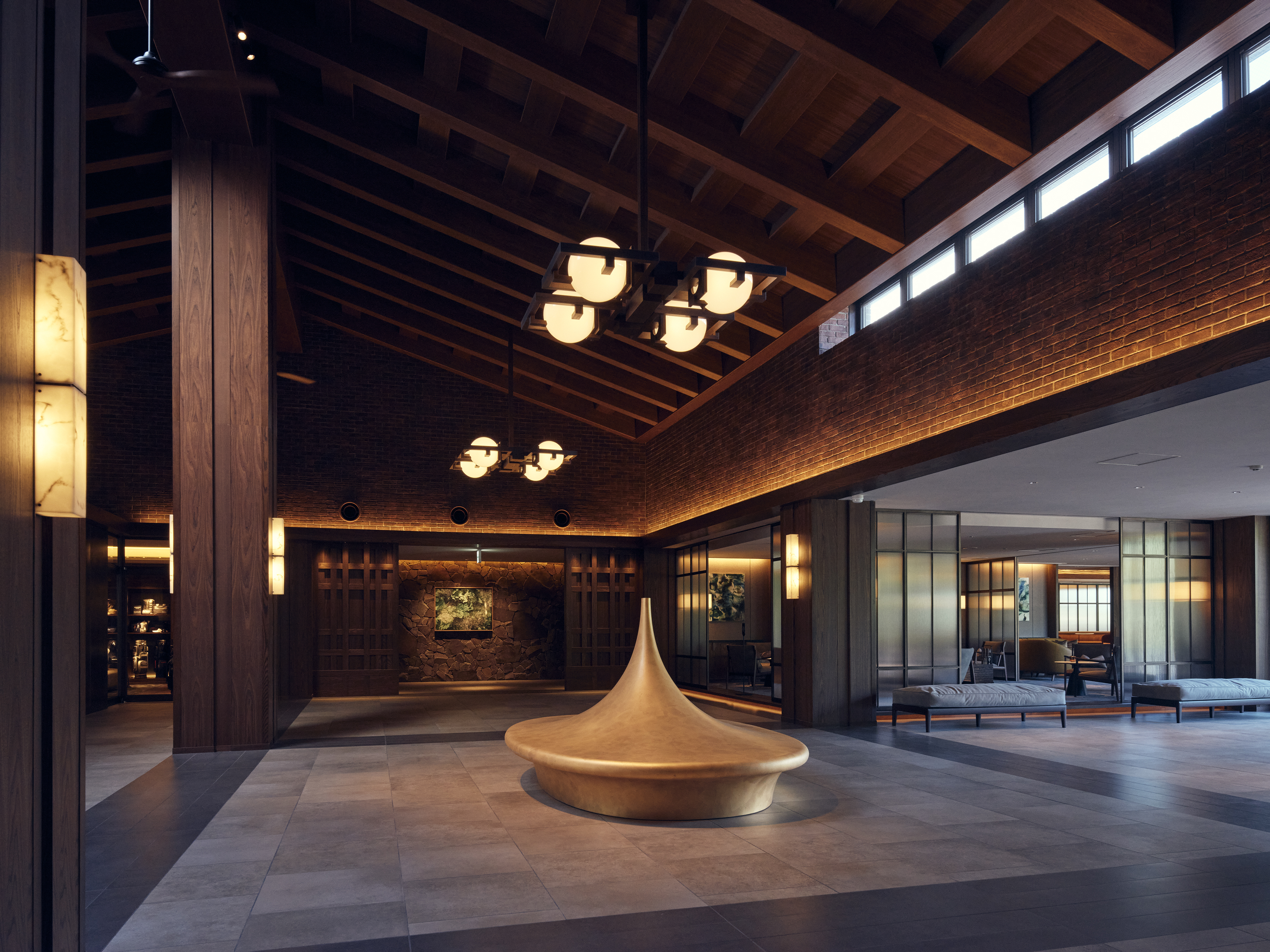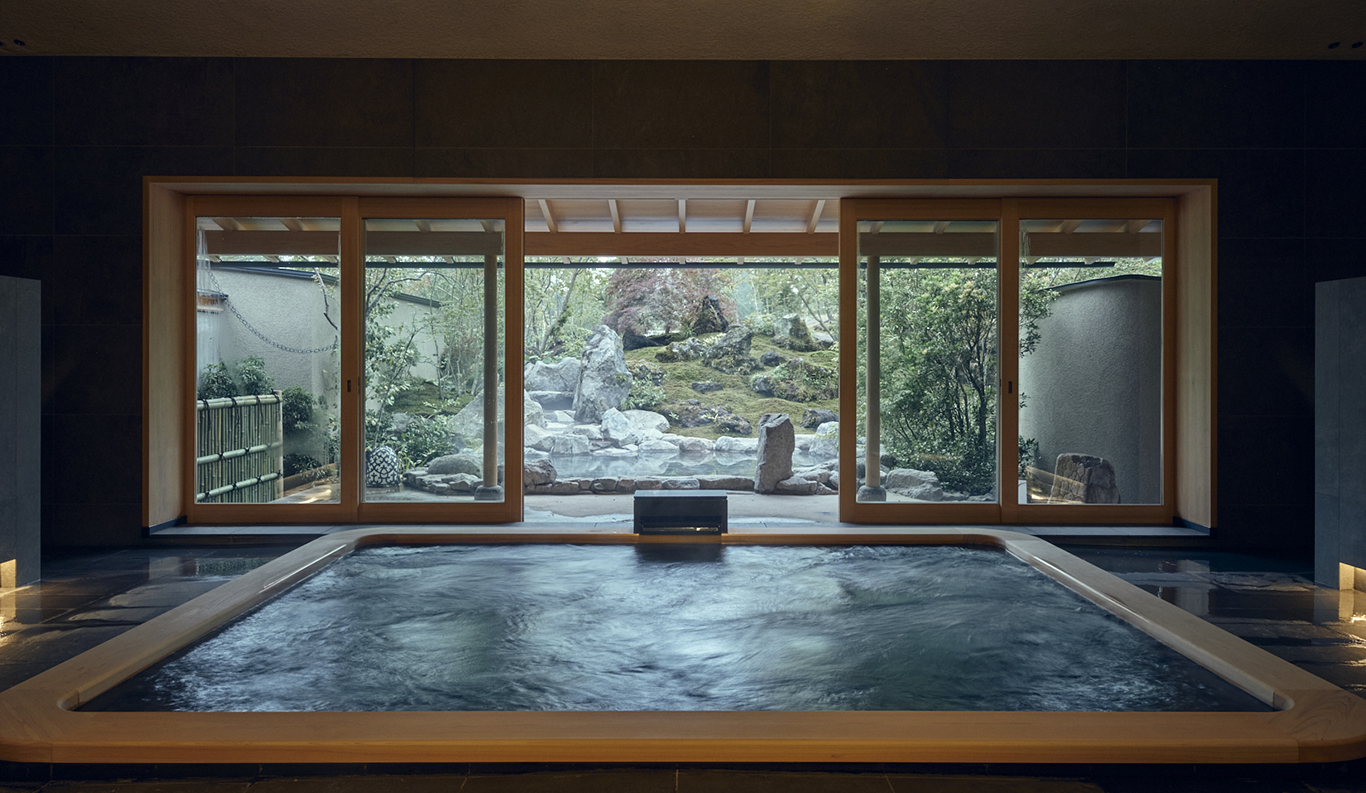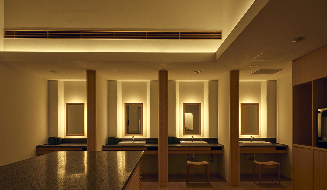 Adjacent to the communal grand baths is a lounge space for post-soak relaxation. Contemplate th…
