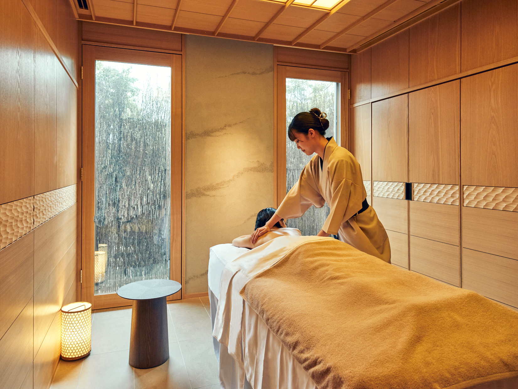 The full-service Kadan Spa bases its signature treatments around pristine snowmelt groundwater, purified by centuries seeping through Fuji’s volcanic soil and complemented by native medicinal herbs, fermented koji rice, and rare tachibana citrus oil indigenous to the area. Highlights include a dedicated head spa room where guests are swaddled in soothing warmth and darkness as cascading waters flow over the scalp, gently bringing every nerve to tingling life and eliciting sympathetic goose bumps from fingers to toes. Another unique amenity is a private bath for long, limbering pre-massage soaks.