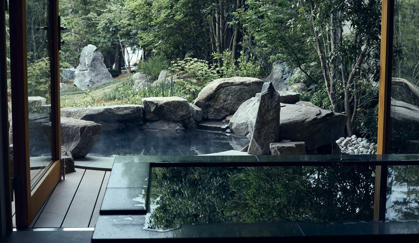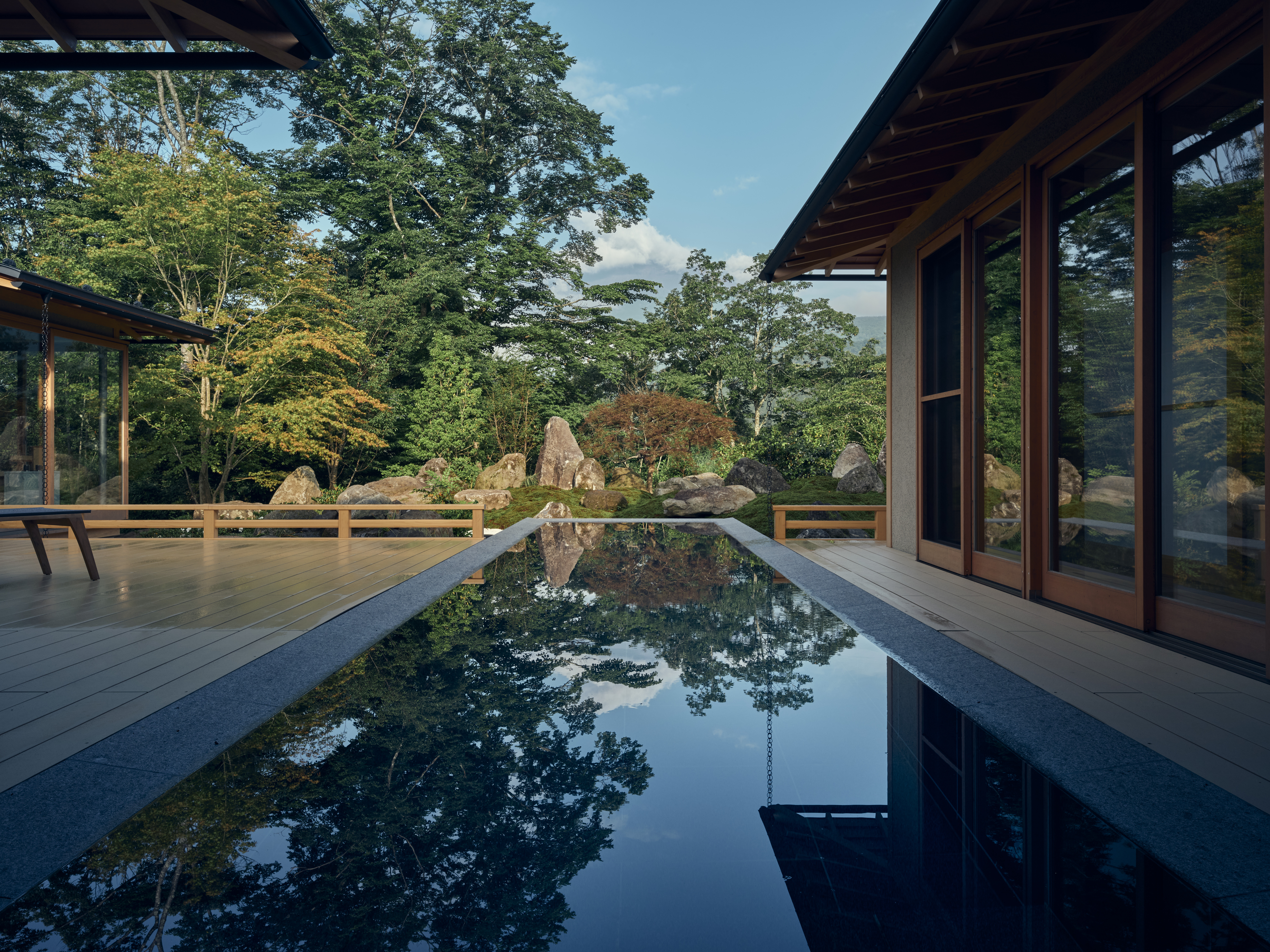 The two garden suites are on the ground floor of the secluded western wing and offer expansive verandas, private gardens, and open-air hot spring baths sheltered by the property’s encircling forest. Mine, or “foothills,” has an outdoor bath of volcanic boulders seeming to emerge from the landscape itself, while the tidy indoor bath is cut from granite and wood. Both offer views of the private Japanese garden, lush with maples, azaleas and verdant moss. In this serene sanctuary, guests can lounge on the veranda, imbibing the crisp and refreshing mountain air, enjoying a morning coffee with the birds or a glass of wine by intimate lanternlight.