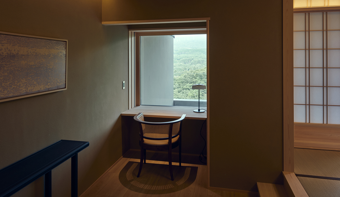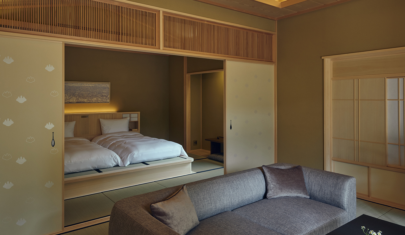 The name of this compact rooftop suite, Kumo or “clouds,” nods to its lofty position on the top floor, situated for optimal views of Mt. Fuji from the living quarters and the bath. A simple lacquer desk, with two seats positioned side by side, faces the mountain, its simple lines immediately evoking an image of seating elbow to elbow with a loved one, sipping tea and gazing at the view in a moment of shared contemplation. The suite may also be connected to neighboring Kei for larger groups.