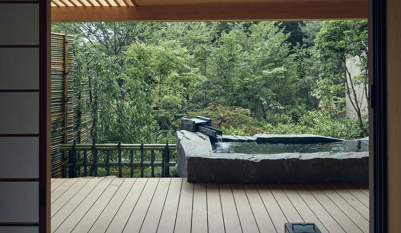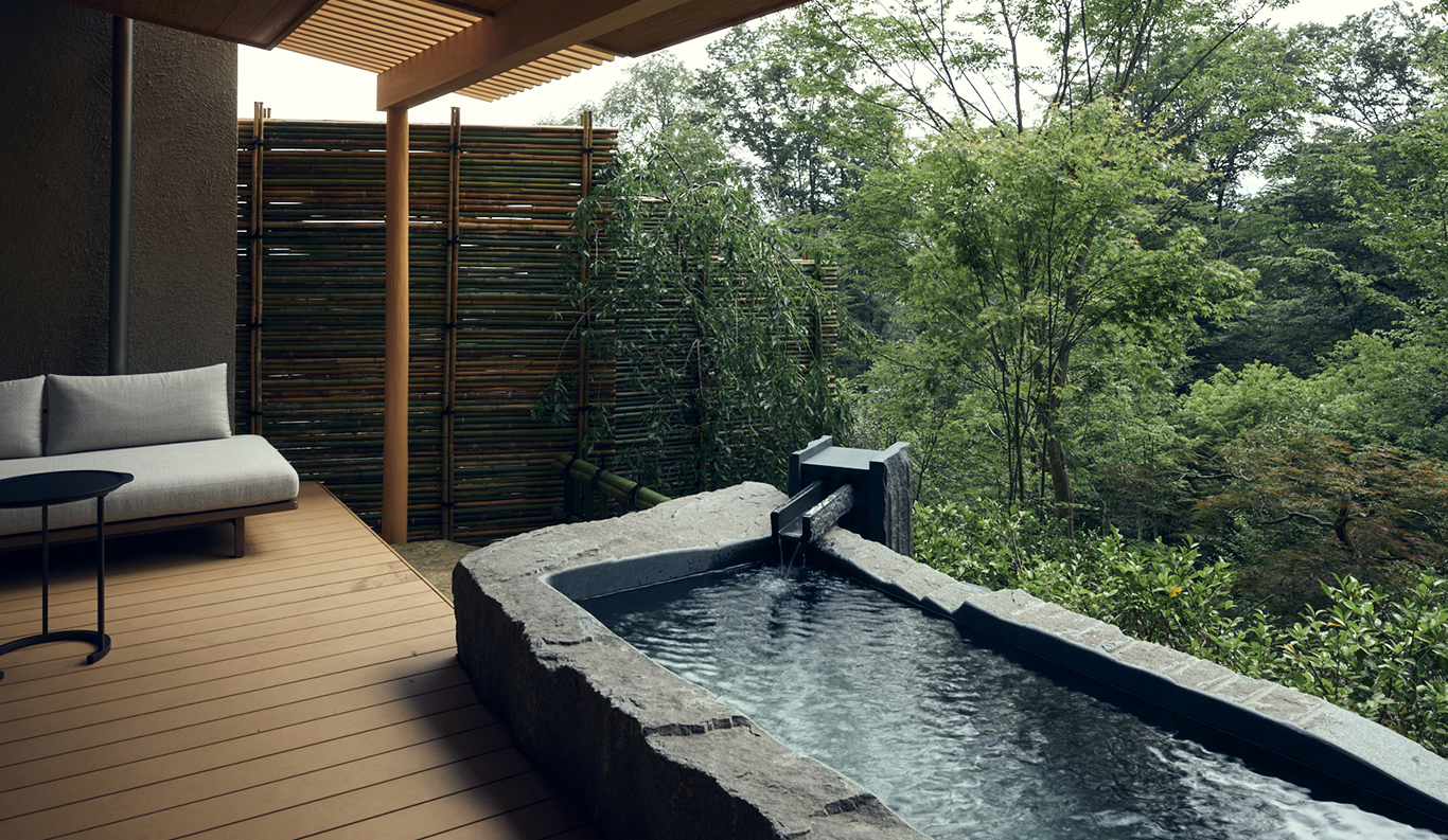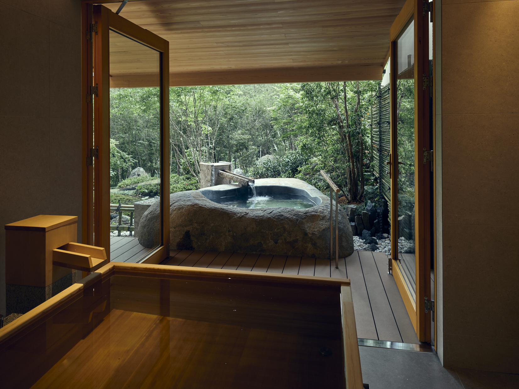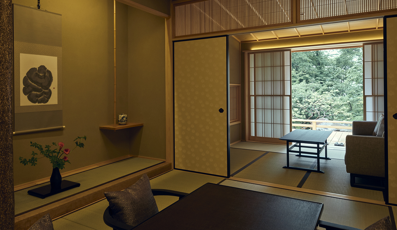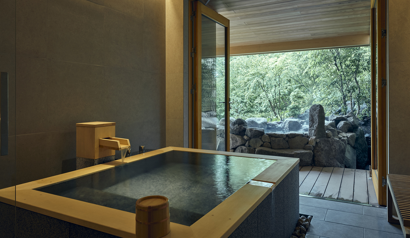 These lower-floor suites have open-air stone baths and verandas abutting the leafy groves of a meticulously groomed Japanese garden transversed by a small stream. A second bath indoors on Aomori hiba wood provides a steamier option with no less verdant views. Indoors, an interior inspired by the elegant simplicity of the tea ceremony invites quiet contemplation. Seated before the tokonoma alcove and sipping a freshly prepared bowl of matcha, guests may be moved to take up the calligraphy kit provided and compose a haiku to memorialize this exquisite moment of Japanese harmony.