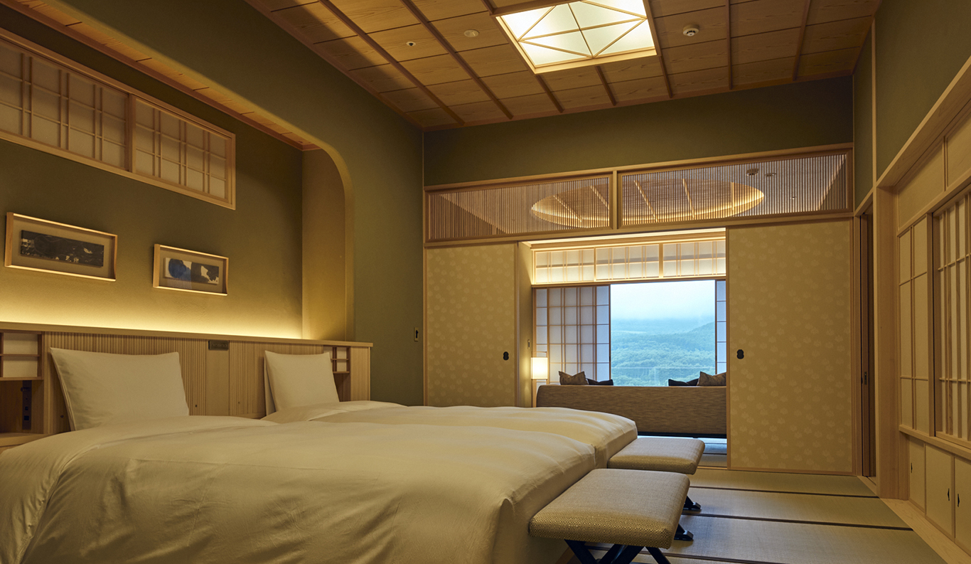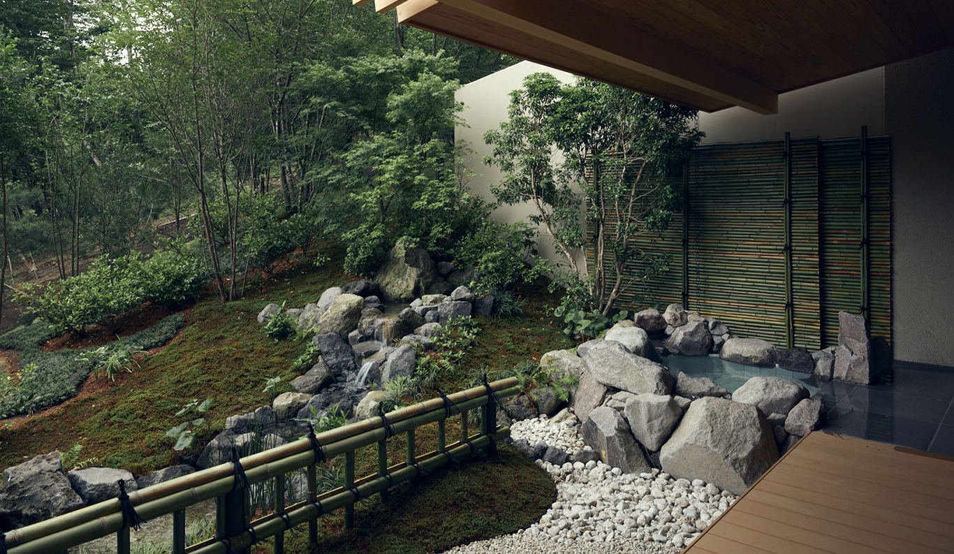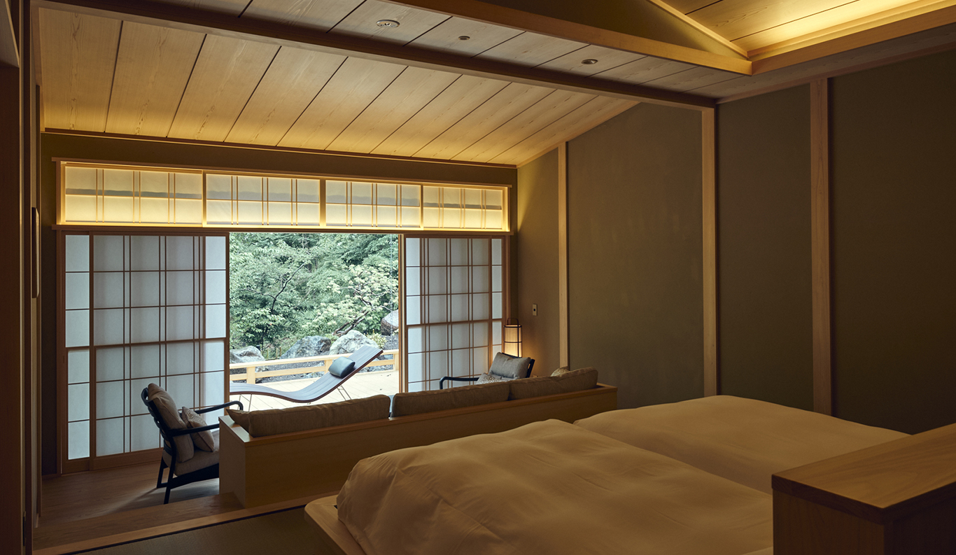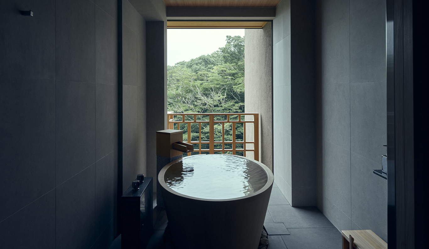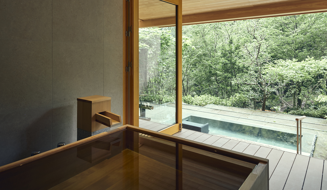 These lower-floor suites have open-air stone baths and verandas abutting the leafy groves of a meticulously groomed Japanese garden transversed by a small stream. A second bath indoors on Aomori hiba wood provides a steamier option with no less verdant views. Indoors, an interior inspired by the elegant simplicity of the tea ceremony invites quiet contemplation. Seated before the tokonoma alcove and sipping a freshly prepared bowl of matcha, guests may be moved to take up the calligraphy kit provided and compose a haiku to memorialize this exquisite moment of Japanese harmony.