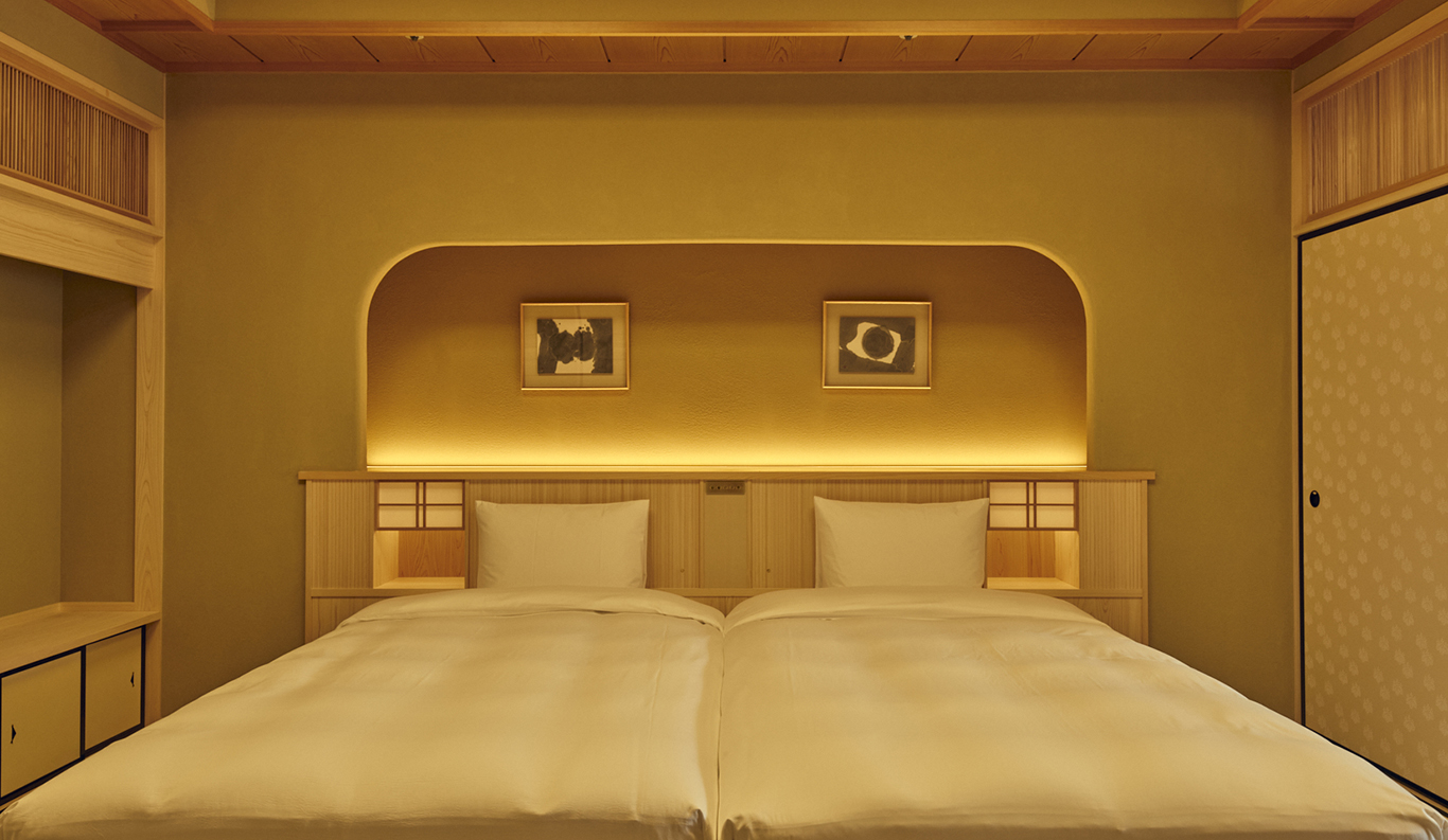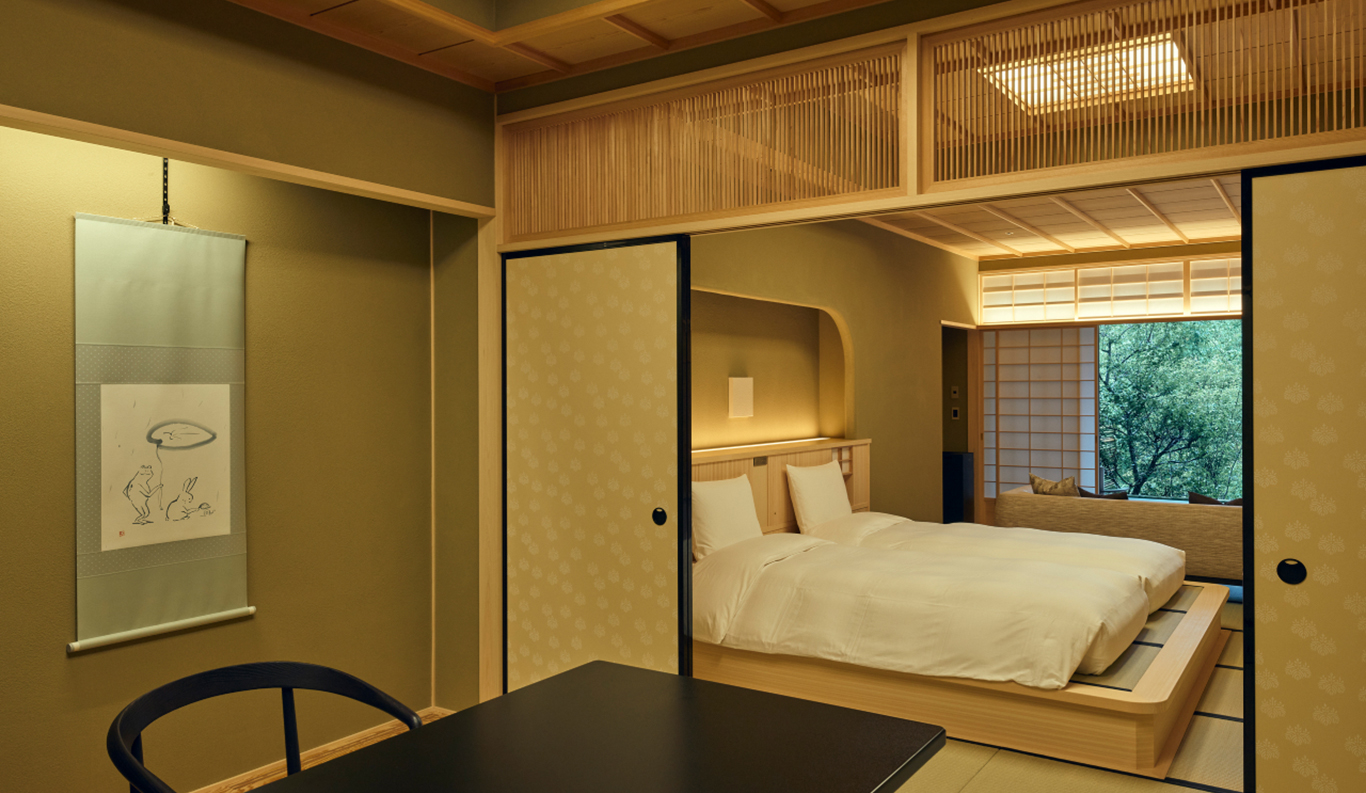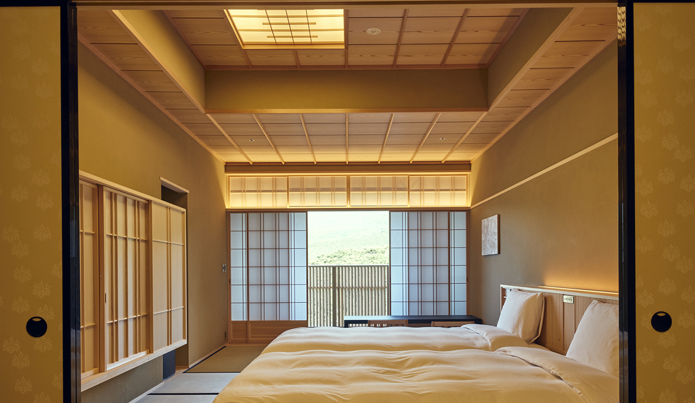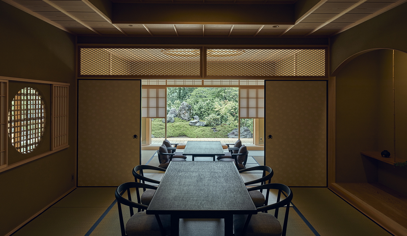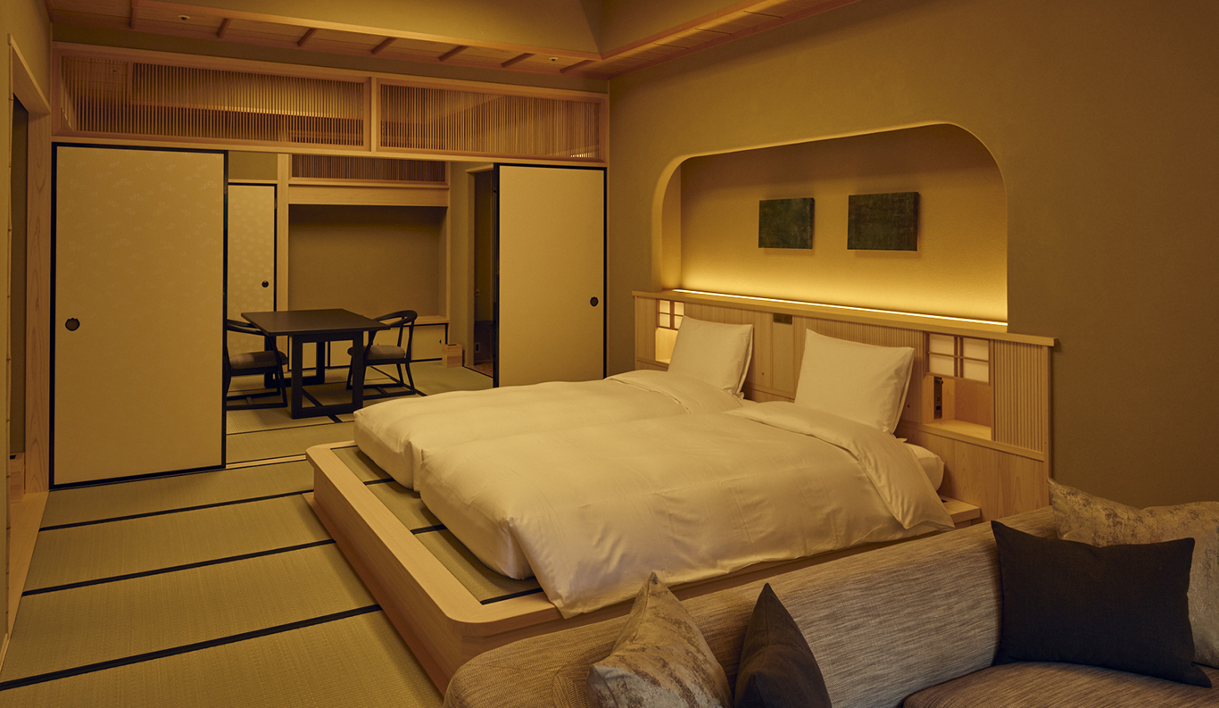 These lower-floor suites have open-air stone baths and verandas abutting the leafy groves of a meticulously groomed Japanese garden transversed by a small stream. A second bath indoors on Aomori hiba wood provides a steamier option with no less verdant views. Indoors, an interior inspired by the elegant simplicity of the tea ceremony invites quiet contemplation. Seated before the tokonoma alcove and sipping a freshly prepared bowl of matcha, guests may be moved to take up the calligraphy kit provided and compose a haiku to memorialize this exquisite moment of Japanese harmony.