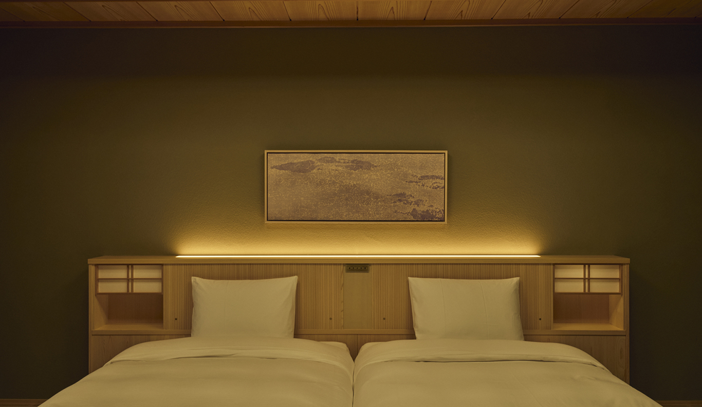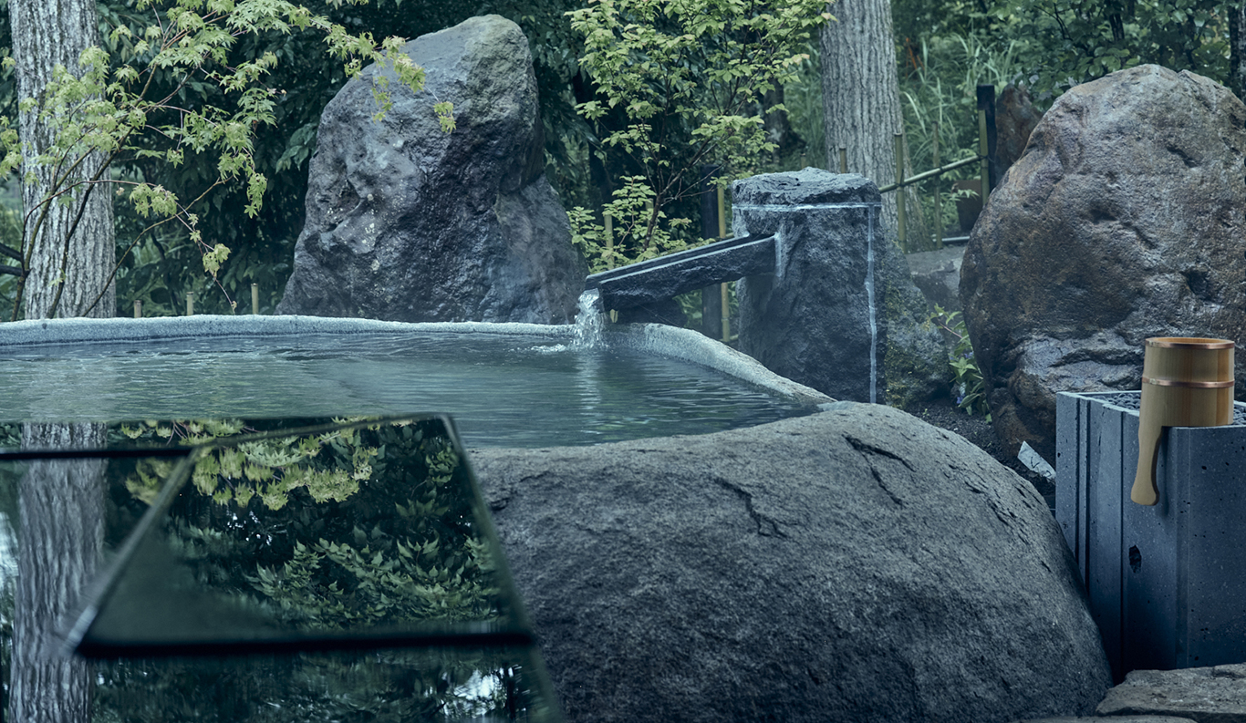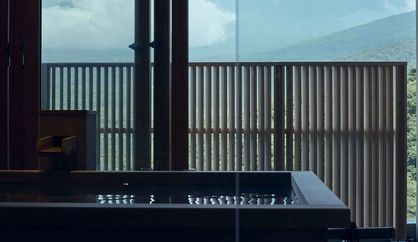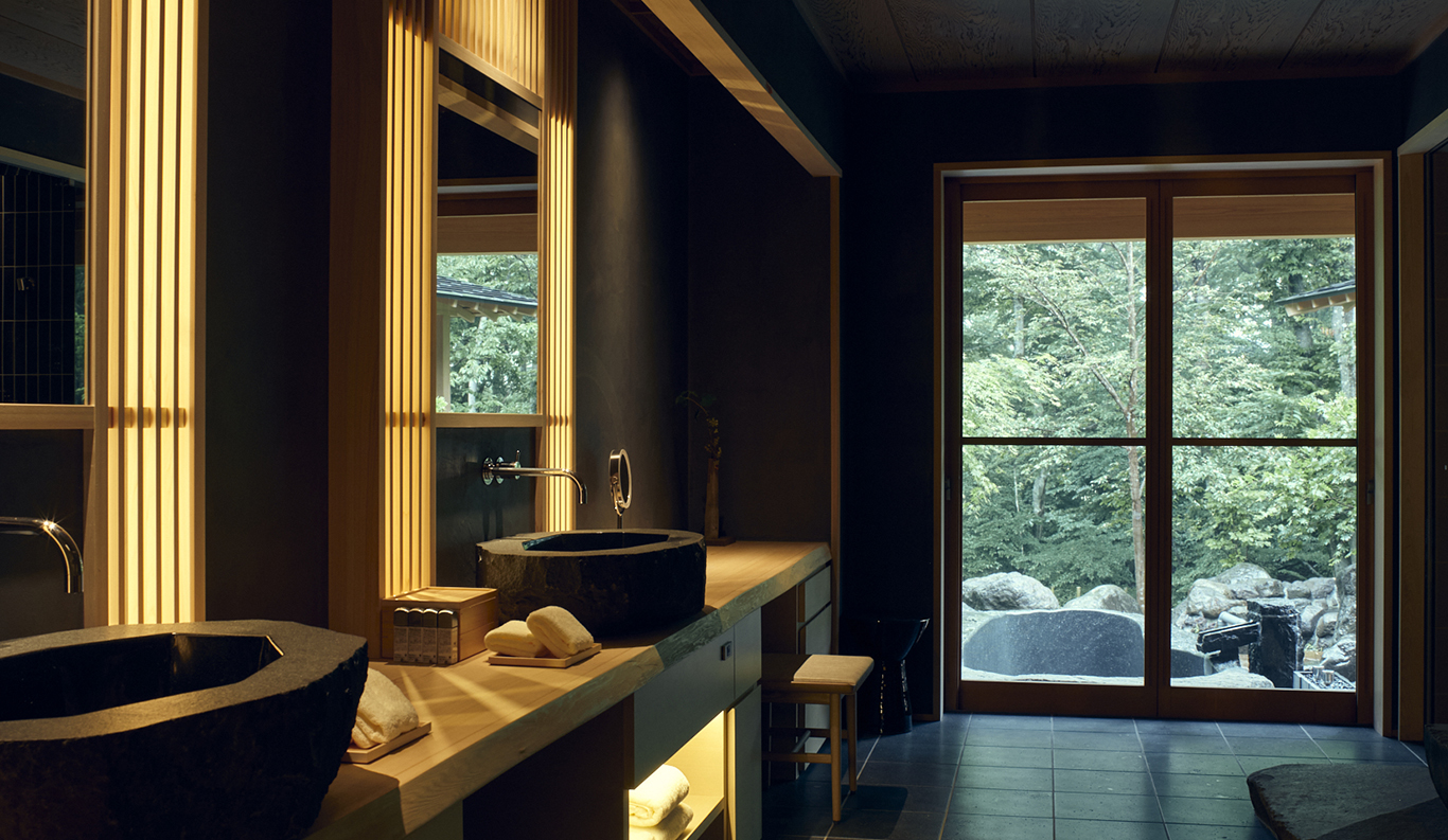 Rooftop Suite Kei, or “silhouette”, evokes Hokusai’s shadowy Shower Below the Summit, a starkly dramatic iteration in his 36 Views. The still waters of panoramic bath reflect the peak before fading into the jet black stone, similar to the way the composition of the woodblock print sweeps from snow-covered summit to dusky foothills. With a combined sitting/dining room and sleeping/living spaces, the suite has ample space to lounge in contemplation of the mountains shifting moods, as well as a steam sauna built into the shower room. The suite may also be connected to neighboring Kumo for larger groups.