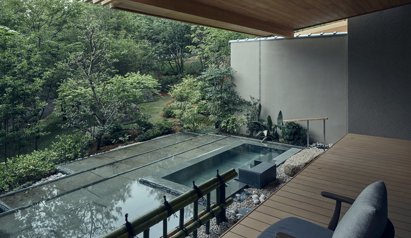 These lower-floor suites have open-air stone baths and verandas abutting the leafy groves of a meticulously groomed Japanese garden transversed by a small stream. A second bath indoors in polished granite or Kiba wood provides a steamier option with no less verdant views. Indoors, an interior inspired by the elegant simplicity of tea ceremony invites quiet contemplation. Seated before the tokonoma alcove and sipping a freshly prepared bowl of matcha, guests may be moved to take up the calligraphy kit provided and compose a haiku to memorialize this exquisite moment of Japanese harmony.