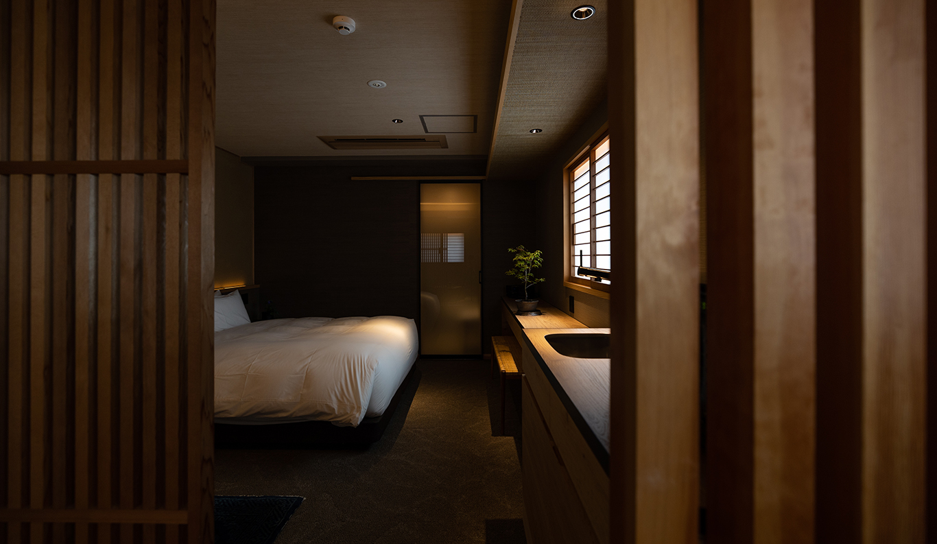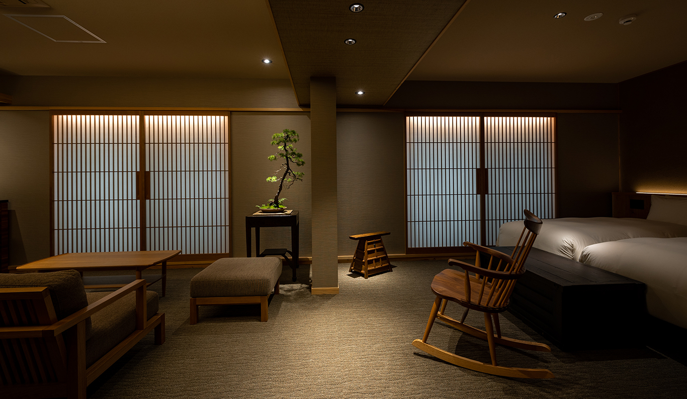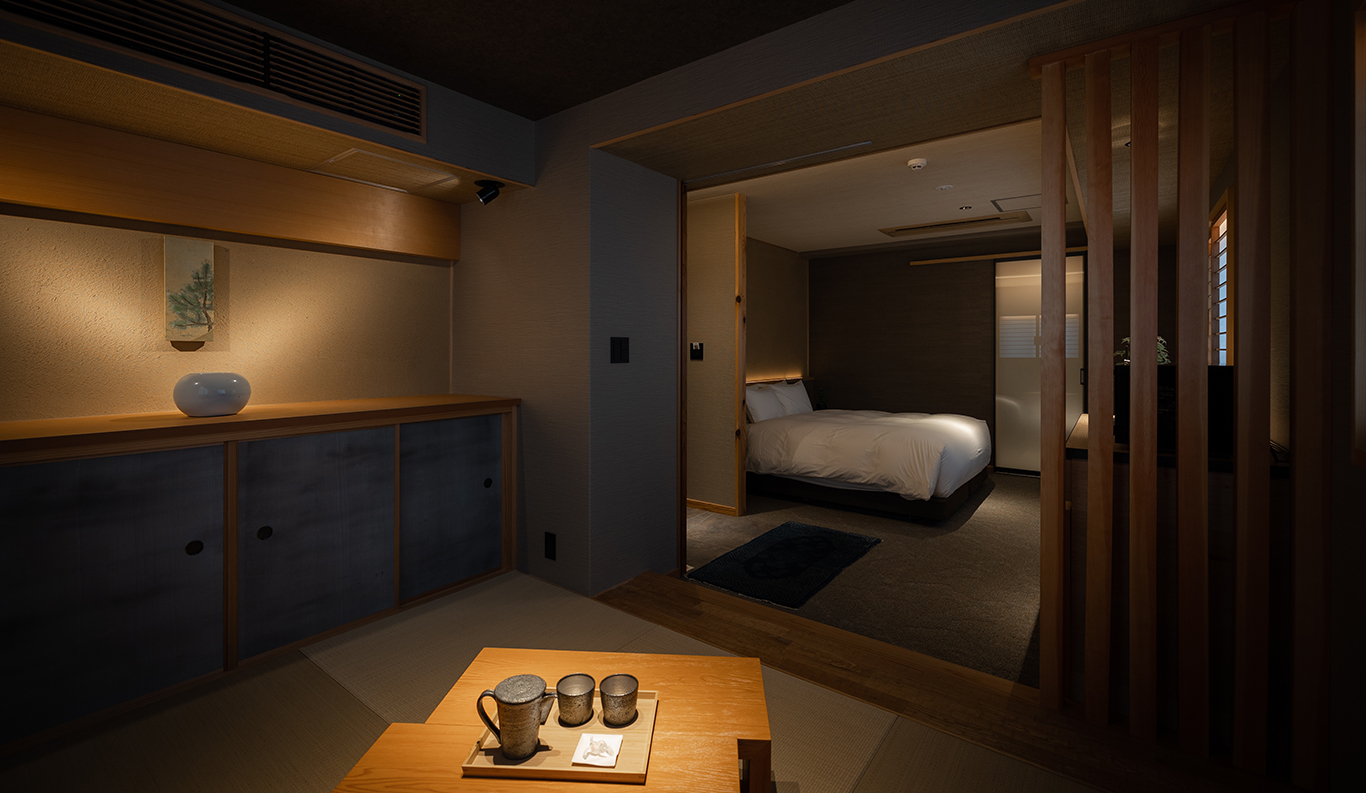 Yuuin - This premium suite shares a name with a teahouse constructed by famed master Sen no Sotan. However, while the characters Sotan used meant second retirement, the homophone characters here mean “evening retreat,” what this suite will surely be after a busy day exploring Kyoto. The suite has the same layout and design concept as Bousen, but has carpeting rather than hard floors and slate-black tiling in the bathroom. In the tea room, the bespoke karakami panels are made with copper, expected to burnish with notes of verdigris green over time, accenting the celebrated pure white Shino glazing on the Mino ware vase on the counter above them. Ask *Room rates at the Ryokan vary depending on the season and booking status. Therefore, we provide an estimated amount as a reference. REQUEST THIS ROOM -