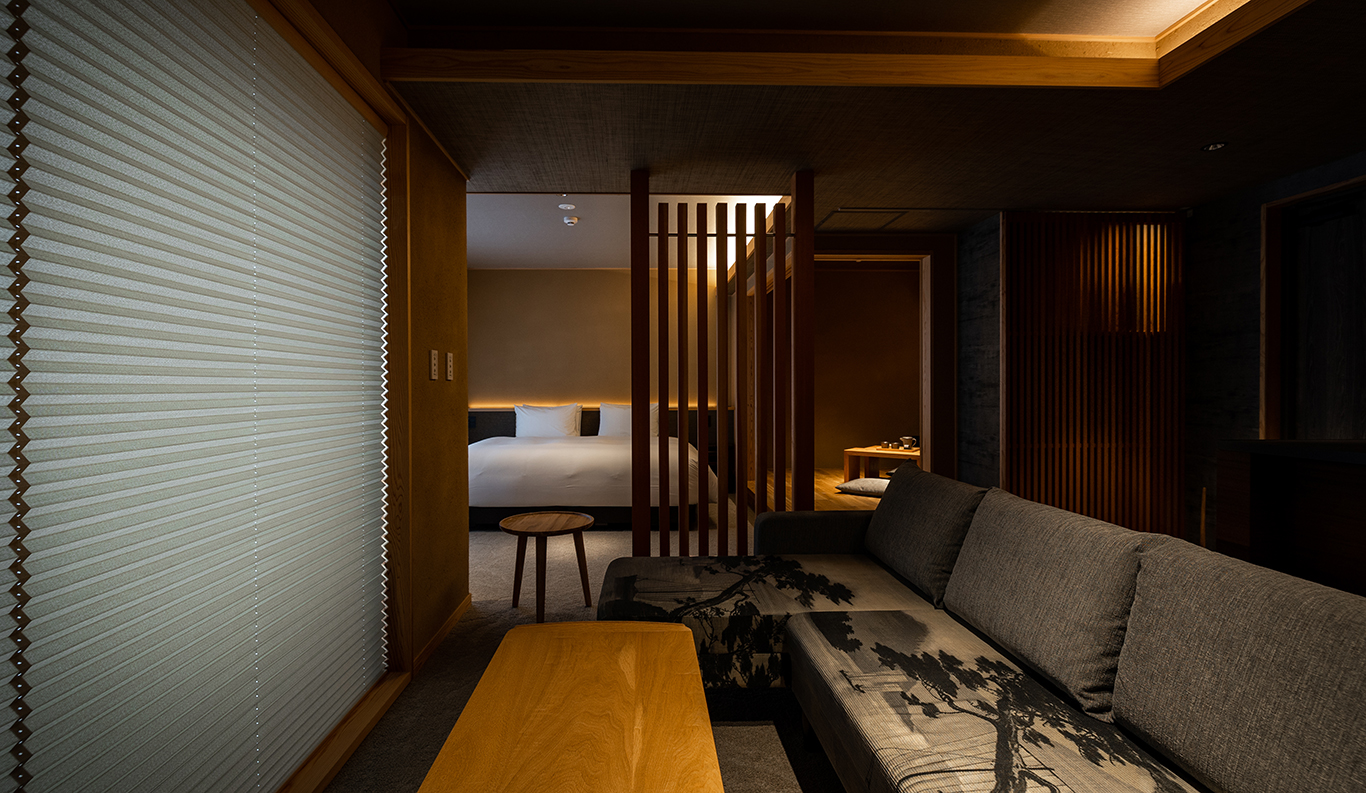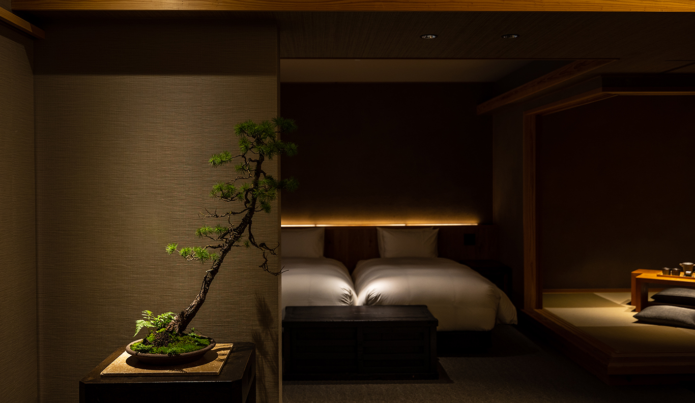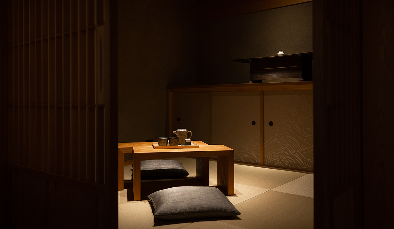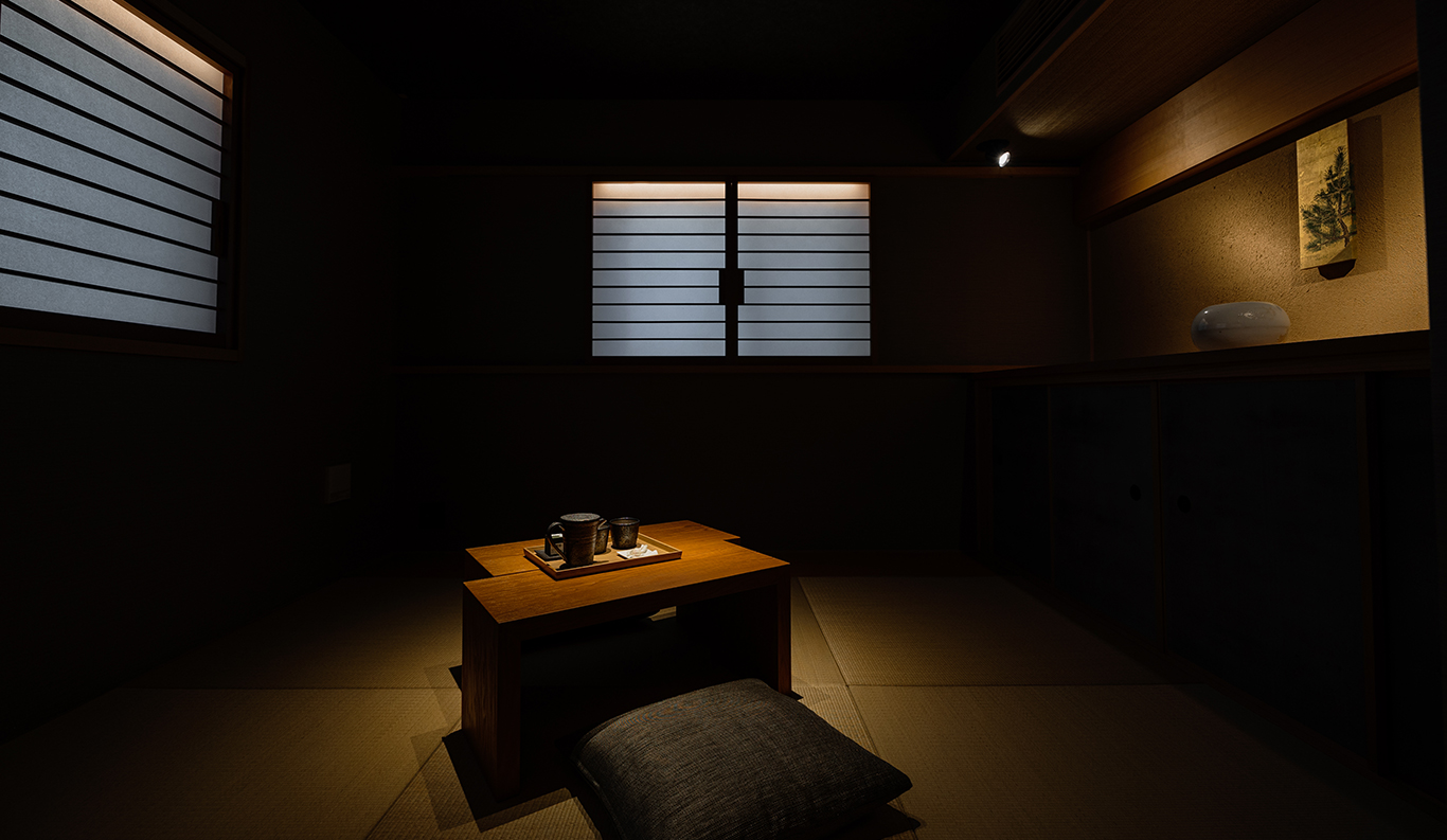 Yuuin - This premium suite shares a name with a teahouse constructed by famed master Sen no Sotan. However, while the characters Sotan used meant second retirement, the homophone characters here mean “evening retreat,” what this suite will surely be after a busy day exploring Kyoto. The suite has the same layout and design concept as Bousen, but has carpeting rather than hard floors and slate-black tiling in the bathroom. In the tea room, the bespoke karakami panels are made with copper, expected to burnish with notes of verdigris green over time, accenting the celebrated pure white Shino glazing on the Mino ware vase on the counter above them. Ask *Room rates at the Ryokan vary depending on the season and booking status. Therefore, we provide an estimated amount as a reference. REQUEST THIS ROOM -