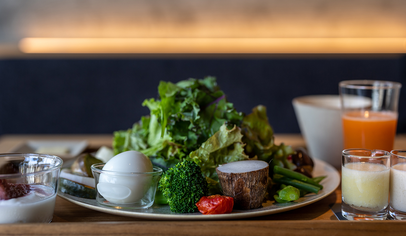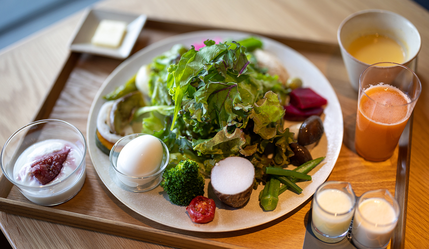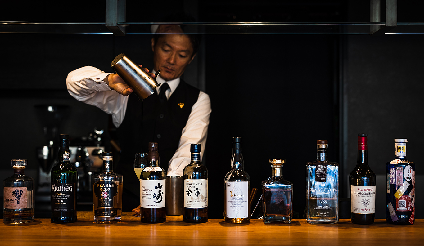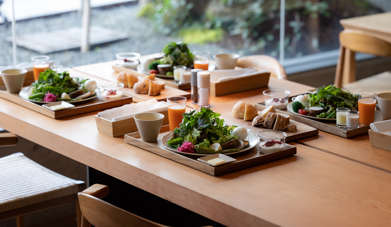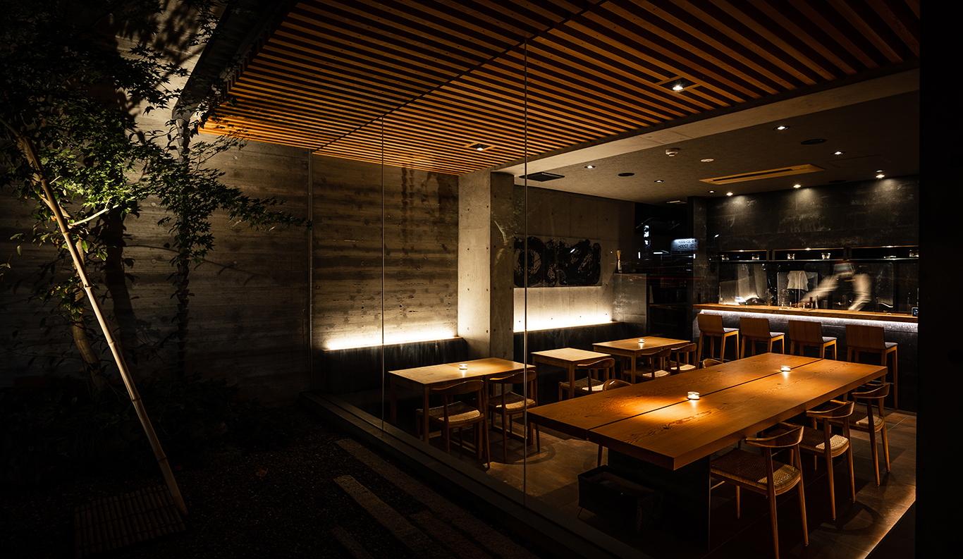 Café and Bar The first-floor café is the venue for a seasonal breakfast created especially for Higashiyama Shikikaboku by chef Ryo Sakatsuji of popular restaurant Pasto Generale. With local organic produce, free-range eggs from Ohara, pastries and bread from bakery Hanakago, and tart yogurt from Miyama, the healthy meal showcases the fresh, flavorful abundance found in Kyoto’s backyard. During the day, the cafe is a peaceful perch to enjoy a cup of tea or coffee and watch the comings and goings of the neighborhood. With a dynamic piece of calligraphy by Rieko Kawabe overlooking warm wood furnishings and a courtyard garden of moss and stones, the space exudes an austere beauty and understated comfort. By night, the space becomes a bar overseen by experienced sommelier Eiki Takahara, whose skill at wine and sake curation is surpassed only by his seasonal fresh-fruit cocktails. Outside guests are welcome, but Higashiyama Shikikaboku doesn’t advertise that fact, so the bar is still a well-kept secret. Of an evening, any other patrons are likely to be friends of the owners from the art and design world and the occasional kimono-clad maiko with client in tow.