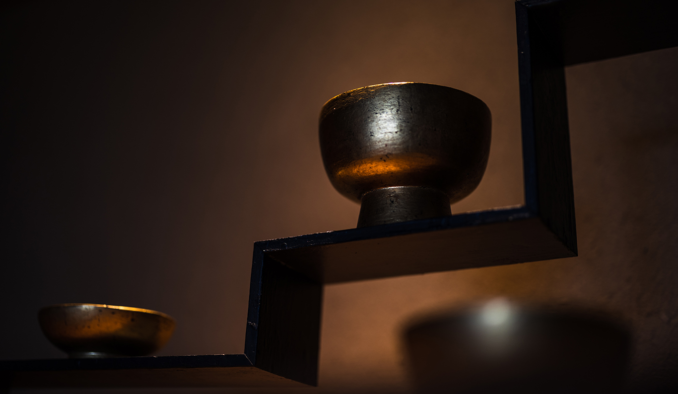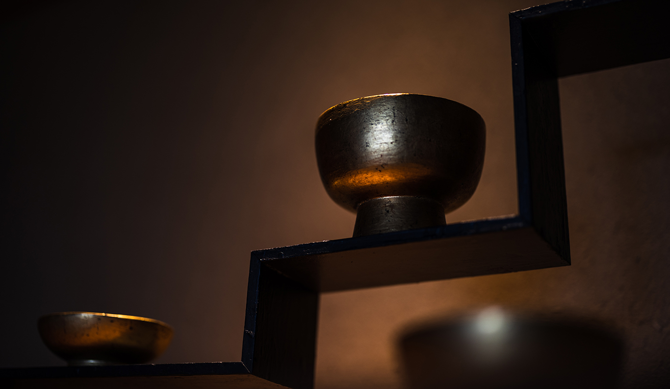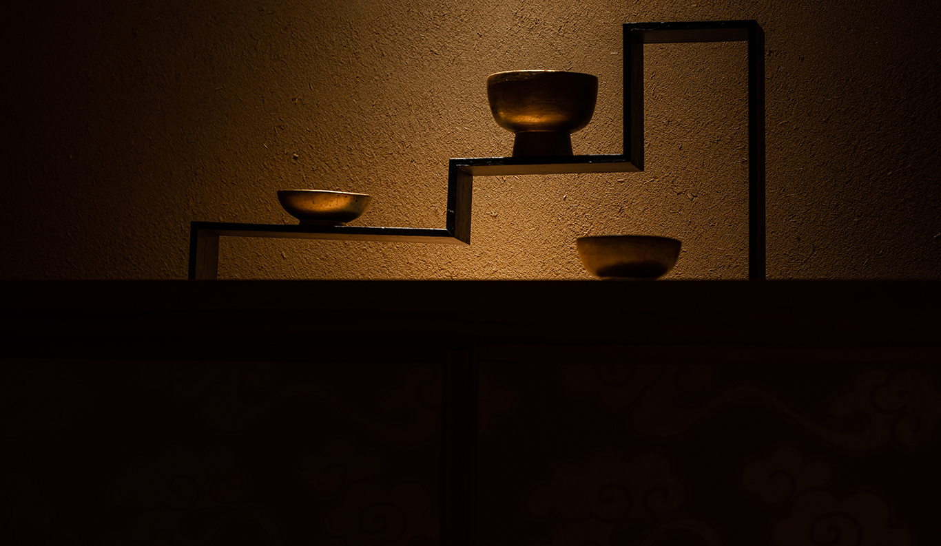 Tearoom Art Owner Kitayama has lovingly selected unique pieces of art to grace the tearooms in every suite. Here, 19th-century lacquer bowls have been refinished in gold and displayed on an angular modern shelf for a refined blend of old and new.