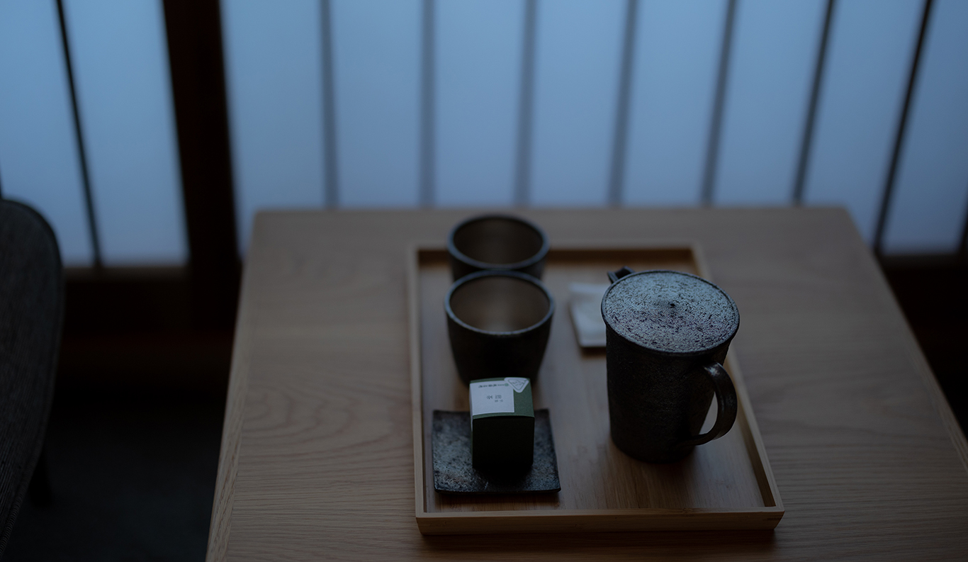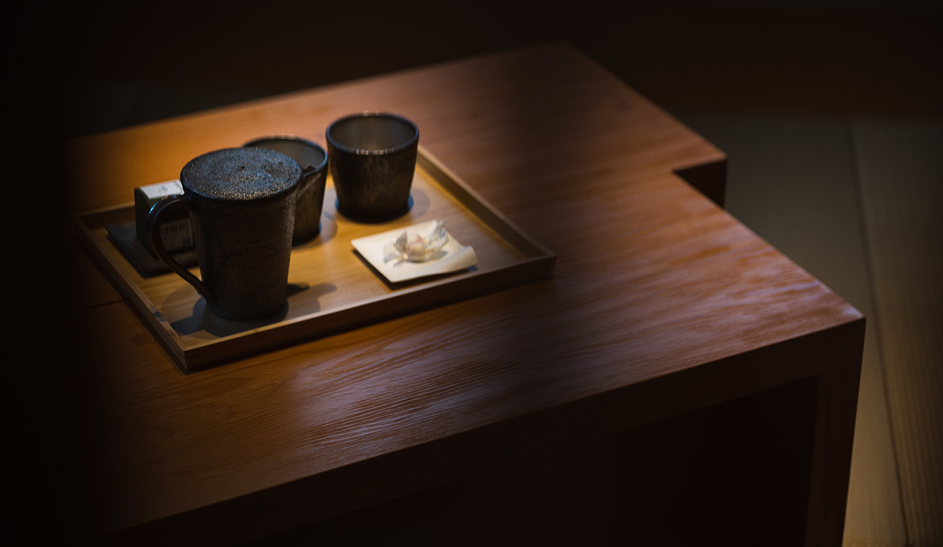 Lobby / Concierge Desk Higashiyama Shikikaboku’s ethos of tailored service and human communication begins with a check-in that is not an empty formality but rather a consultation on accessing the Kyoto of their dreams. Guests are ushered to a quiet space on the second floor and seated at a golden wood counter carved from a single piece of Amur cork. Over a cup of silky green tea from Uji’s Yoshida Meichaen, one of Japan’s oldest producers, the knowledgeable staff inquire after guests’ interests and assist in making any necessary reservations or arrangements, as well as recommending off-the-beaten-track spots for an authentic experience of Kyoto only possible through local insight. As owner Kawakami puts it, their job is to ensure every stay is full of surprises, large and small. The tatami-floored library adjacent is open to guests at all hours as a place to relax or draw inspiration from the many volumes related to Kyoto art and history.