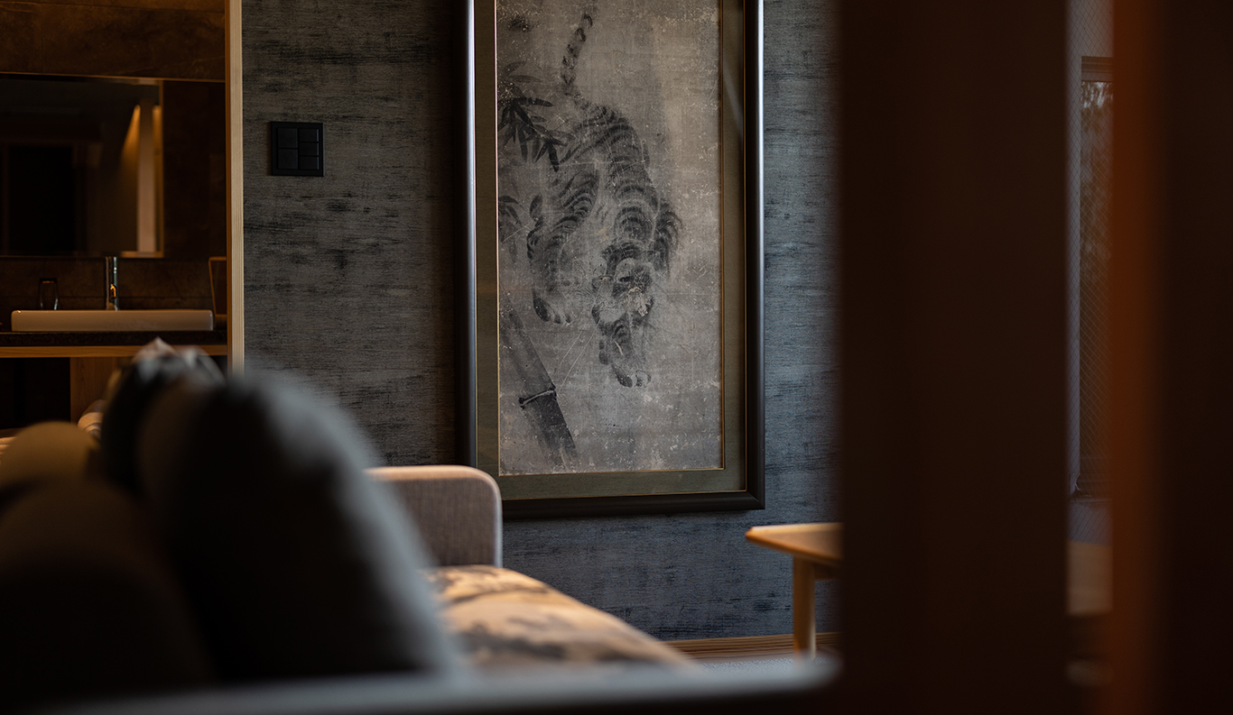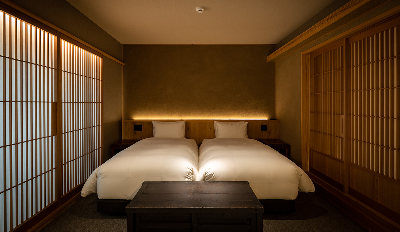 1-3 33 sqm Indoor Bath Bed Bousen - The name of this premium suite (Forgotten Fish Trap) comes from a tearoom at Kyoto’s Daitokuji Temple. It is a reference to the Zhuang Zhou proverb “The fish trap exists because of the fish; once you've gotten the fish, you forget the trap,” which can be interpreted as a direction to remember the past. The art in this room similarly evokes the connection between past and present with fragments of antique folding screens repurposed as objets d’art and bespoke karakami panels from the kamisoe atelier created using an innovative technique that incorporates metal that will burnish over time. A tatami-floored tearoom and full shower and bath provide plenty of room for relaxation, in addition to the all-natural Noble Isle amenities, bespoke linen sheets, and Japanese-style pajamas designed by the owner herself.