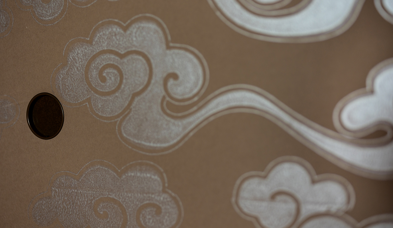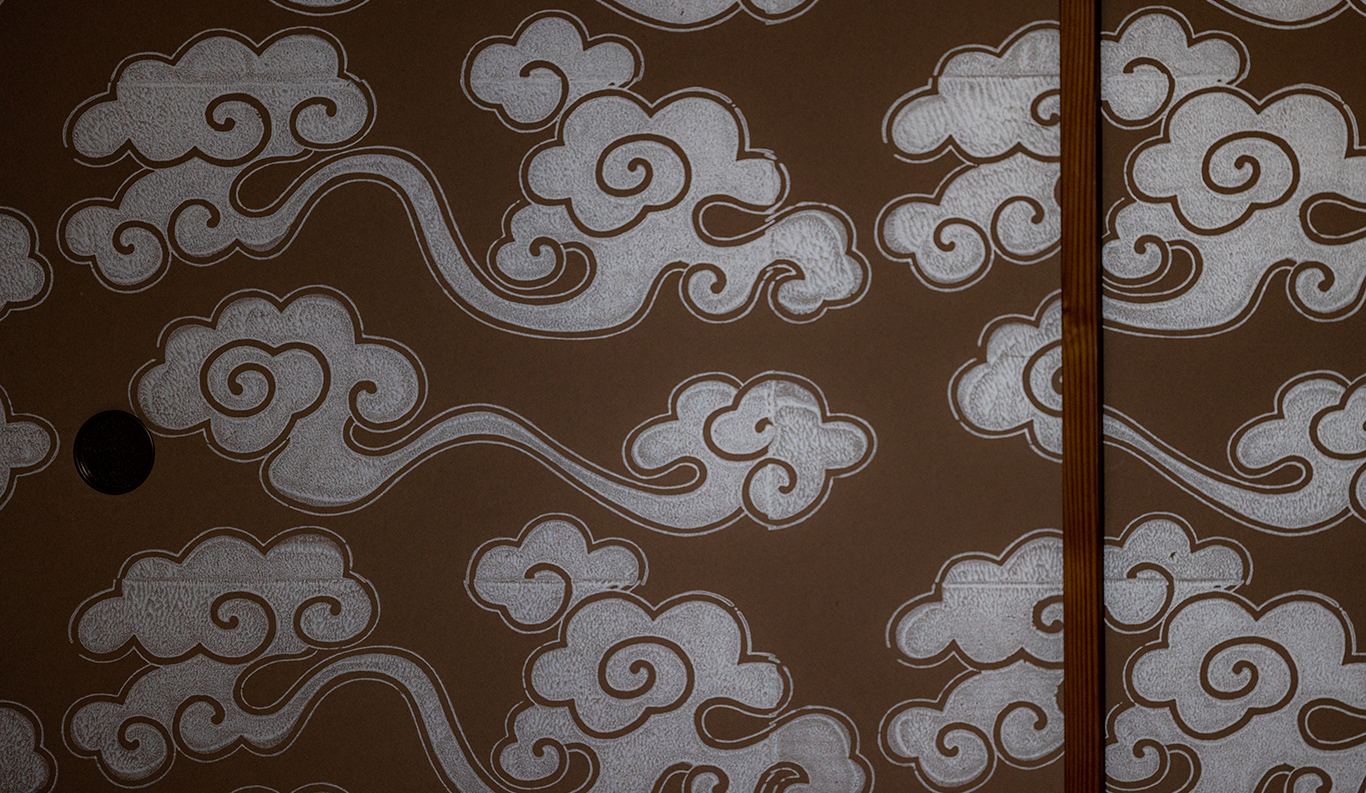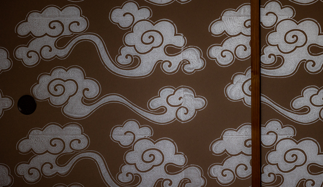 Higashiyama Shikikaboku is proud to use both classic and modern karakami paper from Karacho house atelier Kira Karacho throughout the hotel. The first-floor lobby also features a tile mural depicting a Kira Karacho pattern called The Clouds of Tenpyo , auspicious bringers of life-giving and purifying water. -