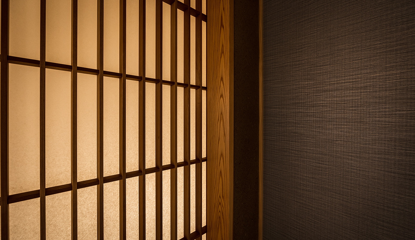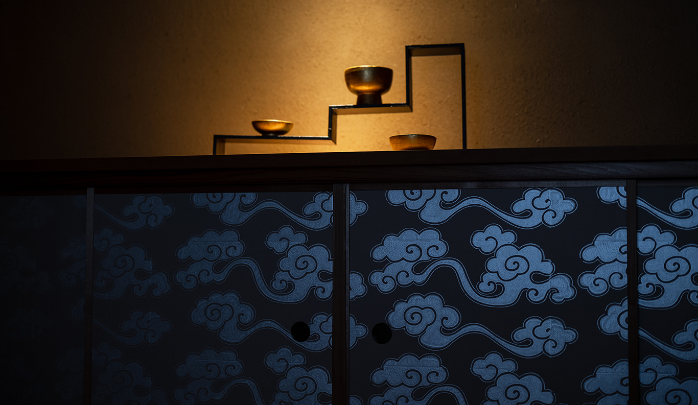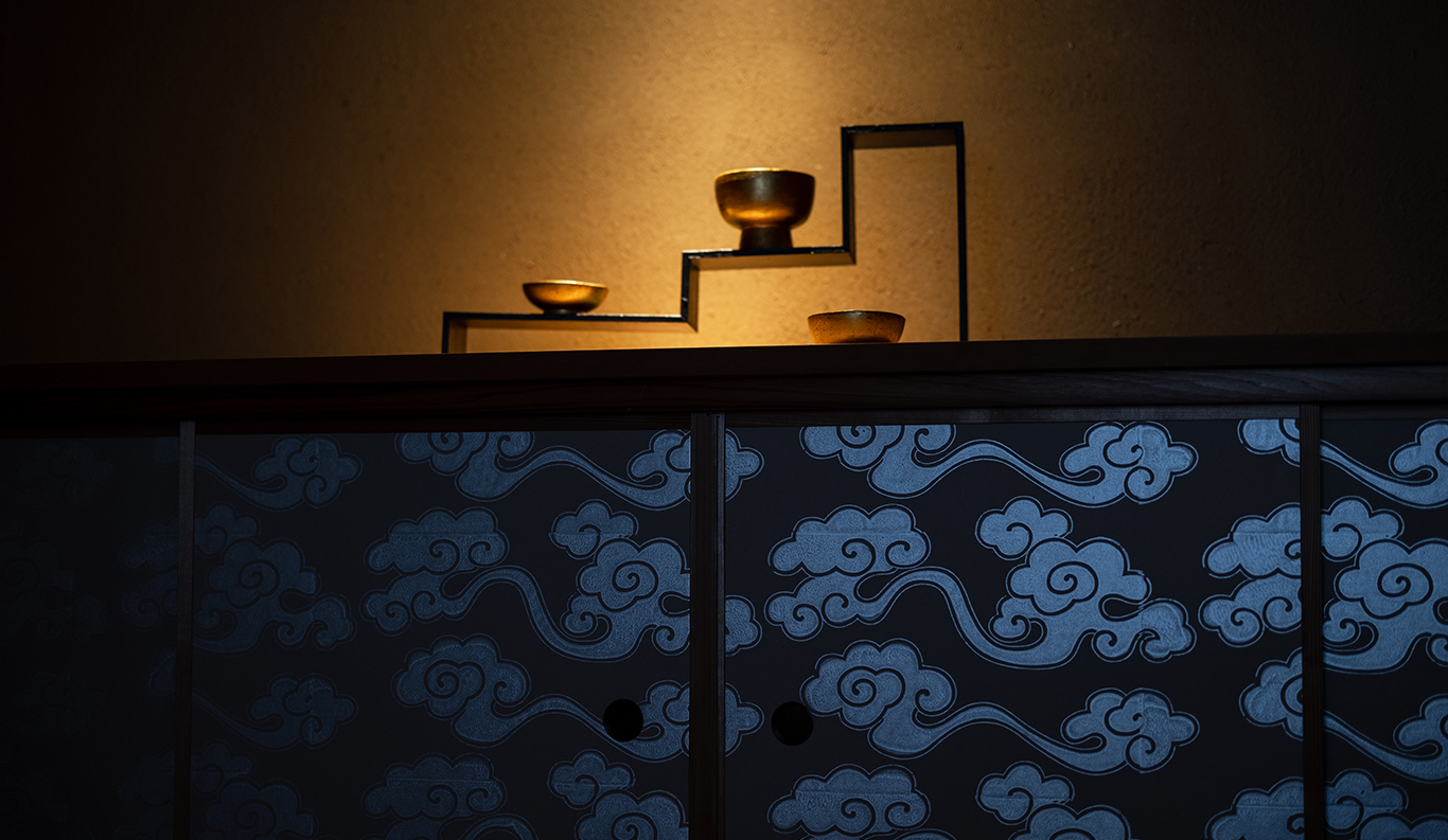 Higashiyama Shikikaboku is proud to use both classic and modern karakami paper from Karacho house atelier Kira Karacho throughout the hotel. The first-floor lobby also features a tile mural depicting a Kira Karacho pattern called The Clouds of Tenpyo , auspicious bringers of life-giving and purifying water. -