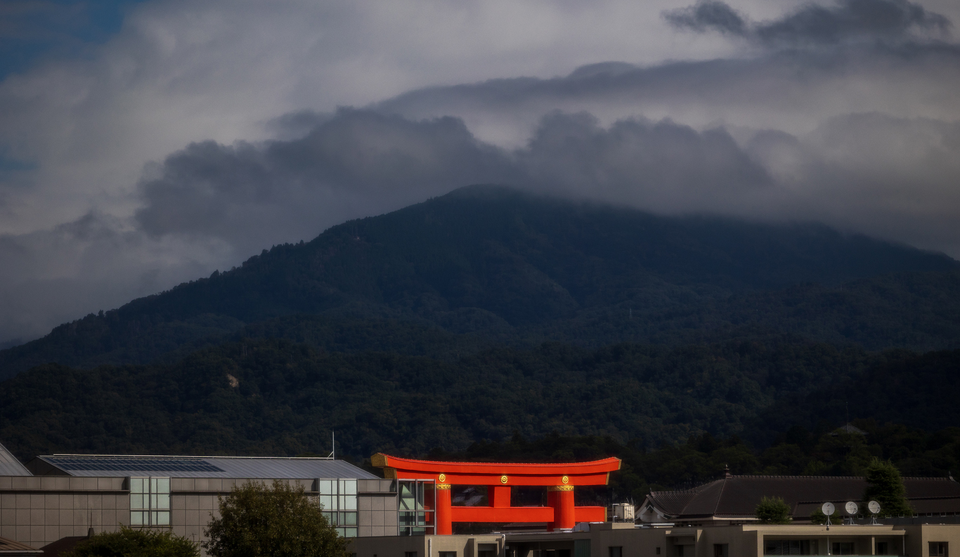 Reiko Kawabe Calligraphy A powerfully dynamic piece of calligraphy hangs above the café and bar space, the creation of artist Reiko Kawabe. It depicts the characters 日ノ山, loosely Mountain of the Sun, a reference nearby Higashiyama, where the 7th-century emperor Tenji is enshrined.