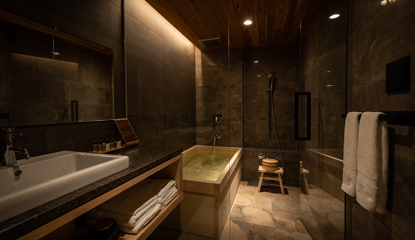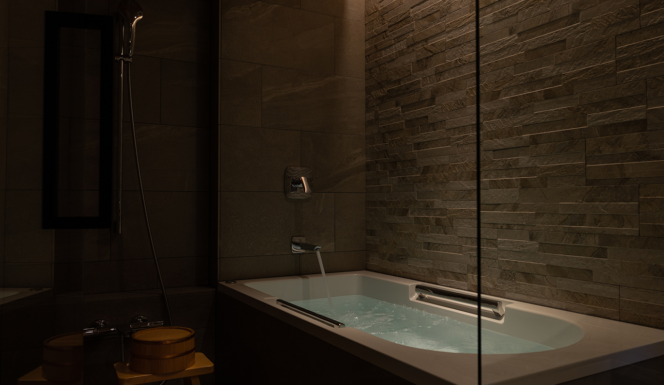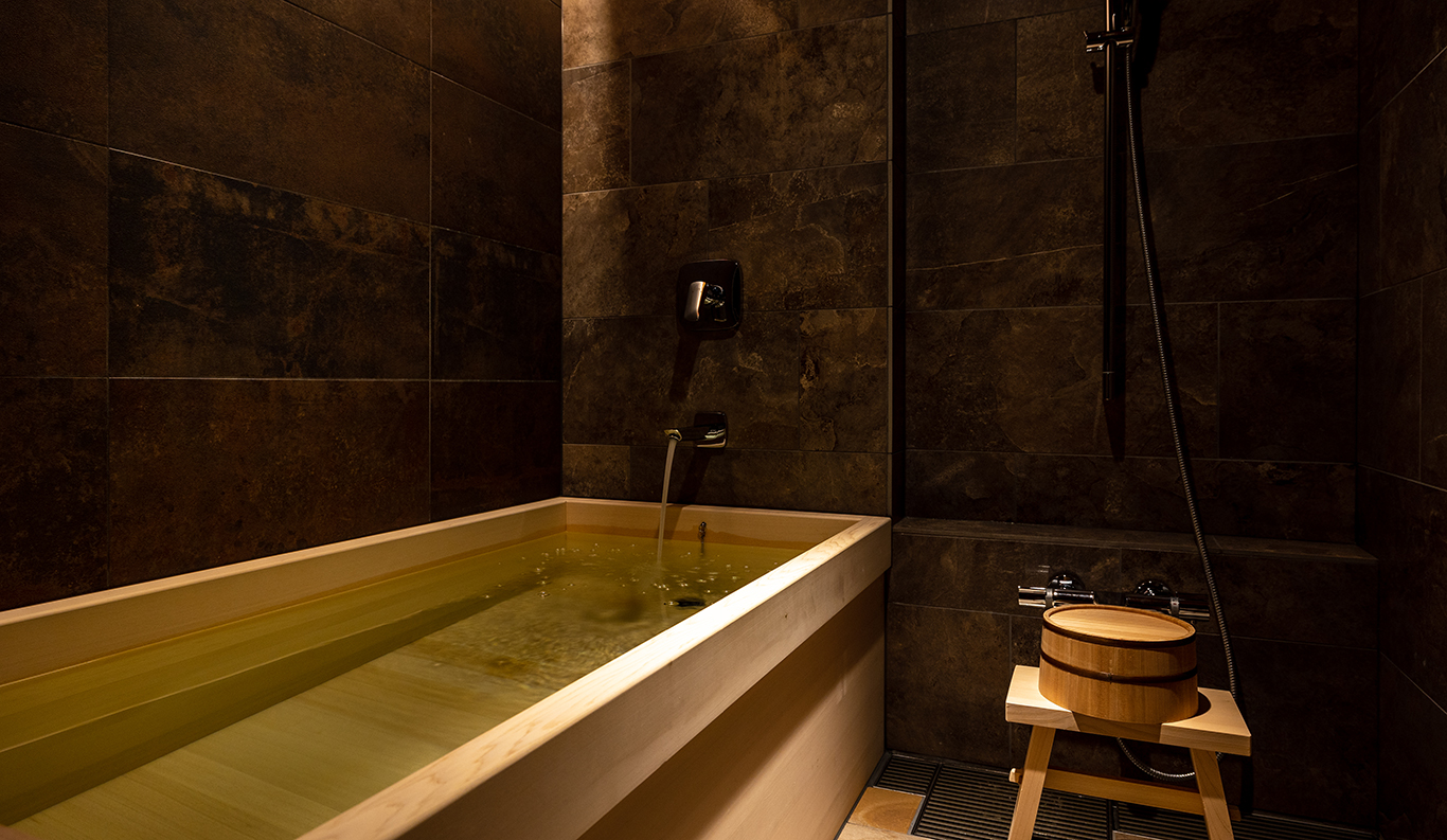 Private Open Air Bath Cleverly concealed from surrounding buildings, the two open-air baths atop Higashiyama Shikikaboku can be reserved for the private use of guests, allowing families and couples to enjoy a soak together. Two Japanese-style showers with traditional hinoki cypress seats provide a place to get clean, while the faintest of music and the gentle poppling of hot water into the stone tub lulls guests into a relaxed state of mind before they’ve even dipped a toe in the steaming bath. Particularly at night, when the stars shine bright overhead, it’s a sublimely tranquil space for physical and mental rejuvenation.