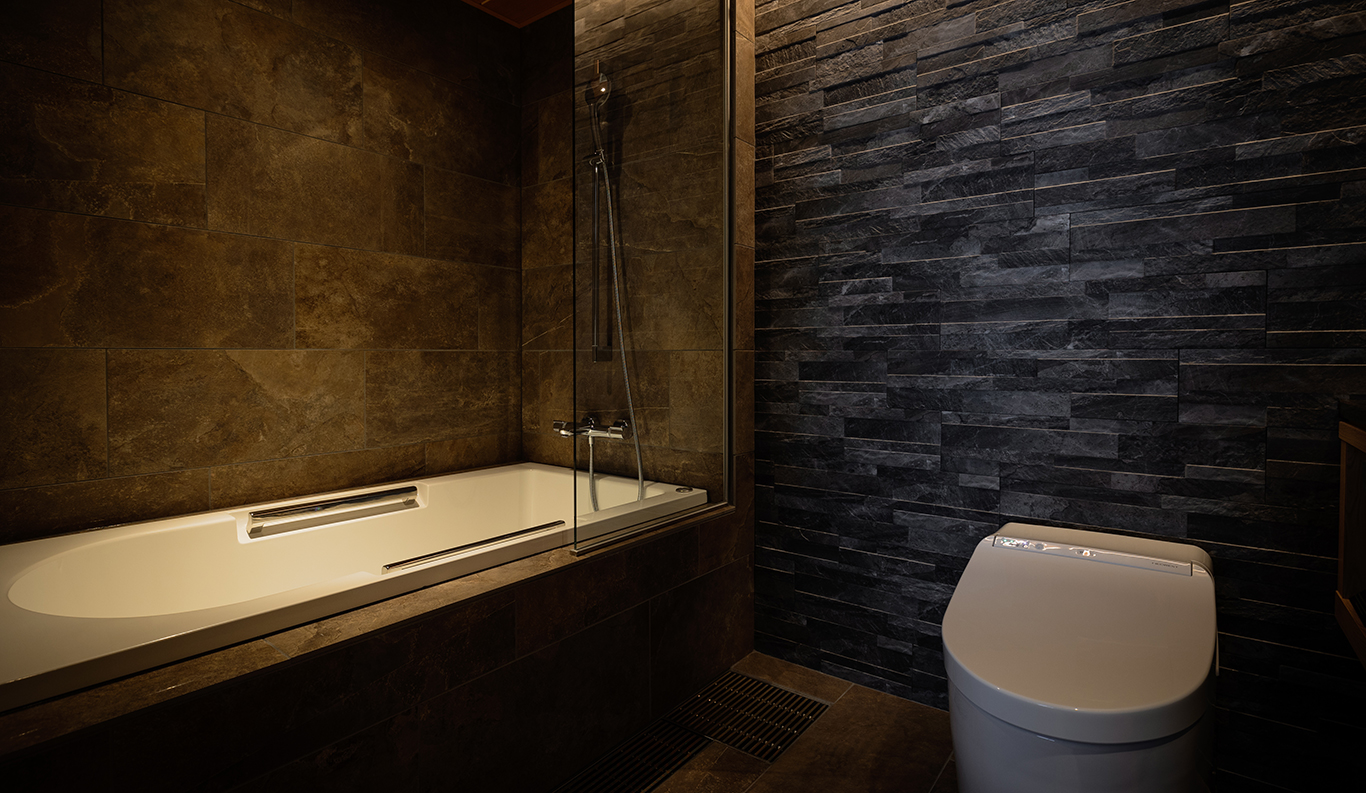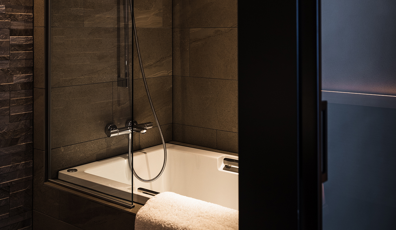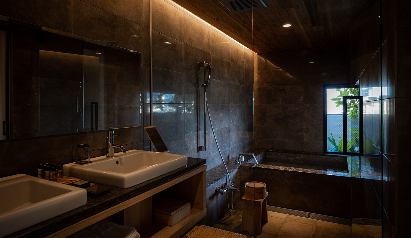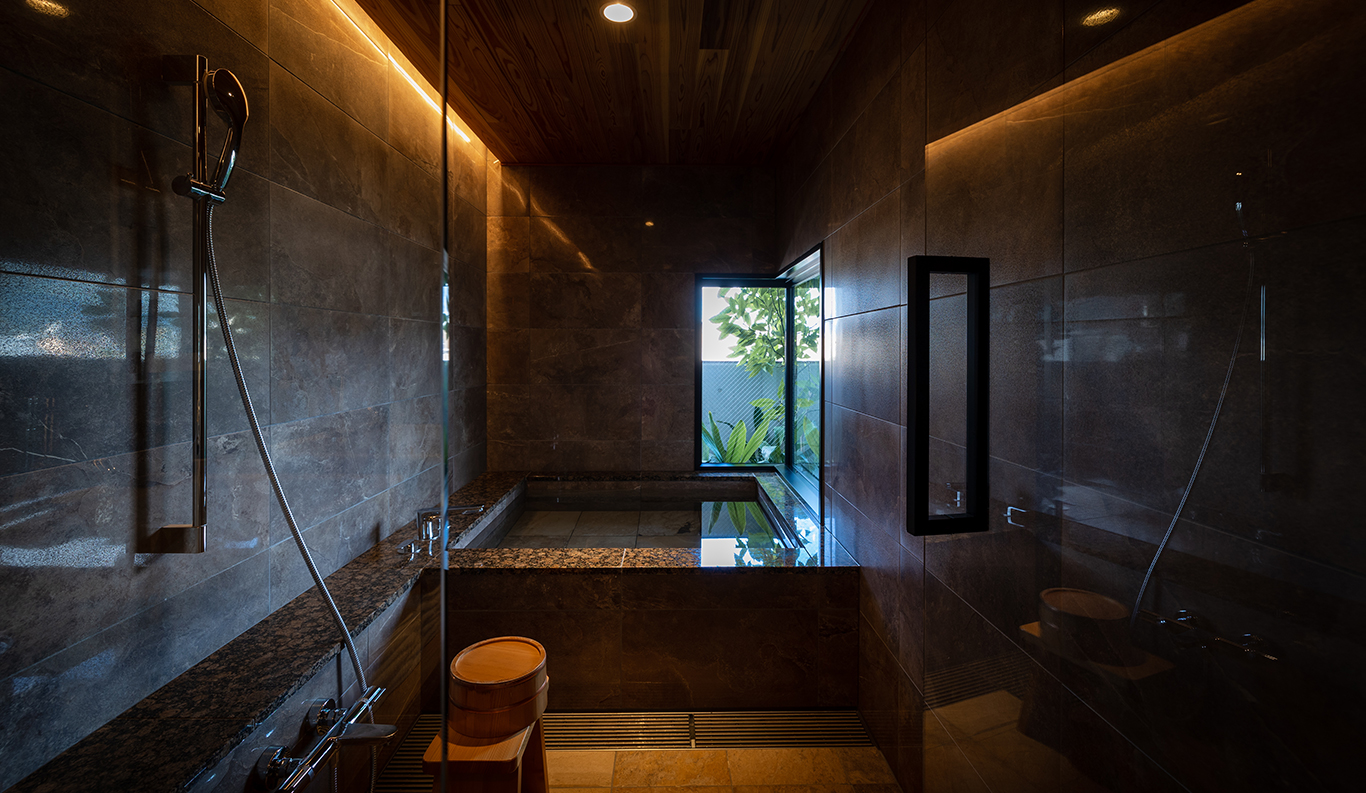 Private Open Air Bath Cleverly concealed from surrounding buildings, the two open-air baths atop Higashiyama Shikikaboku can be reserved for the private use of guests, allowing families and couples to enjoy a soak together. Two Japanese-style showers with traditional hinoki cypress seats provide a place to get clean, while the faintest of music and the gentle poppling of hot water into the stone tub lulls guests into a relaxed state of mind before they’ve even dipped a toe in the steaming bath. Particularly at night, when the stars shine bright overhead, it’s a sublimely tranquil space for physical and mental rejuvenation.
