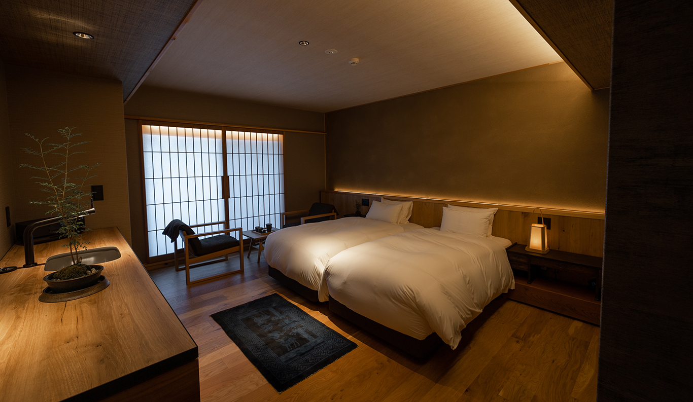 Lovingly designed from the ground up by the husband-and-wife team of architect Takafumi Kawakami and interior designer Masumi Kitayama, both long-term Kyoto residents, the property combines a chic modern sensibility with a deep connection to the city’s ancient culture and crafts. Kawakami’s layout makes excellent use of the canal-side Higashiyama location to offer views of Heian Temple’s iconic red torii gate and the lush eastern mountains from the 8 guest suites. A private open-air bath and rooftop lounge area, rarities in central Kyoto, grace the upper floors. Meanwhile, Kitayama’s thoughtful design weaves an ambiance of understated luxury with one-of-a-kind antiques, seasonally changing bonsai and ikebana, bespoke linens, and the use of handcrafted materials evocative of Japanese tea culture, such as woodblock-printed karakami paper from the centuries-old Karacho house and woven ajiro wickerwork ceilings.