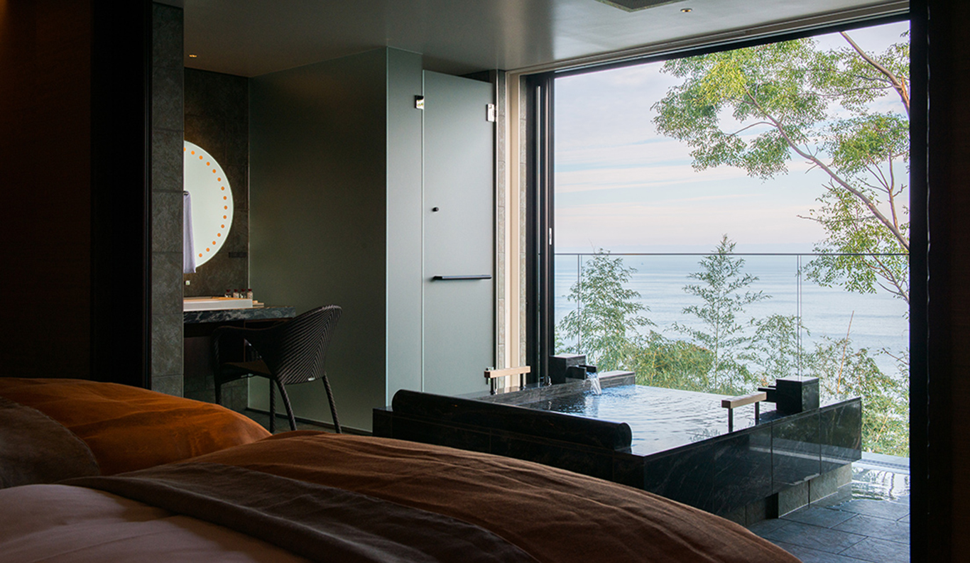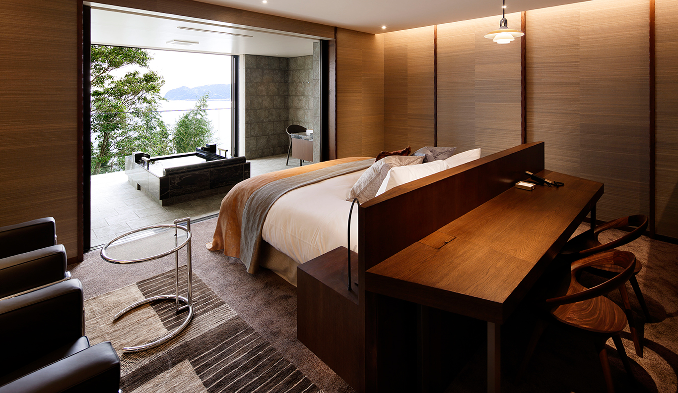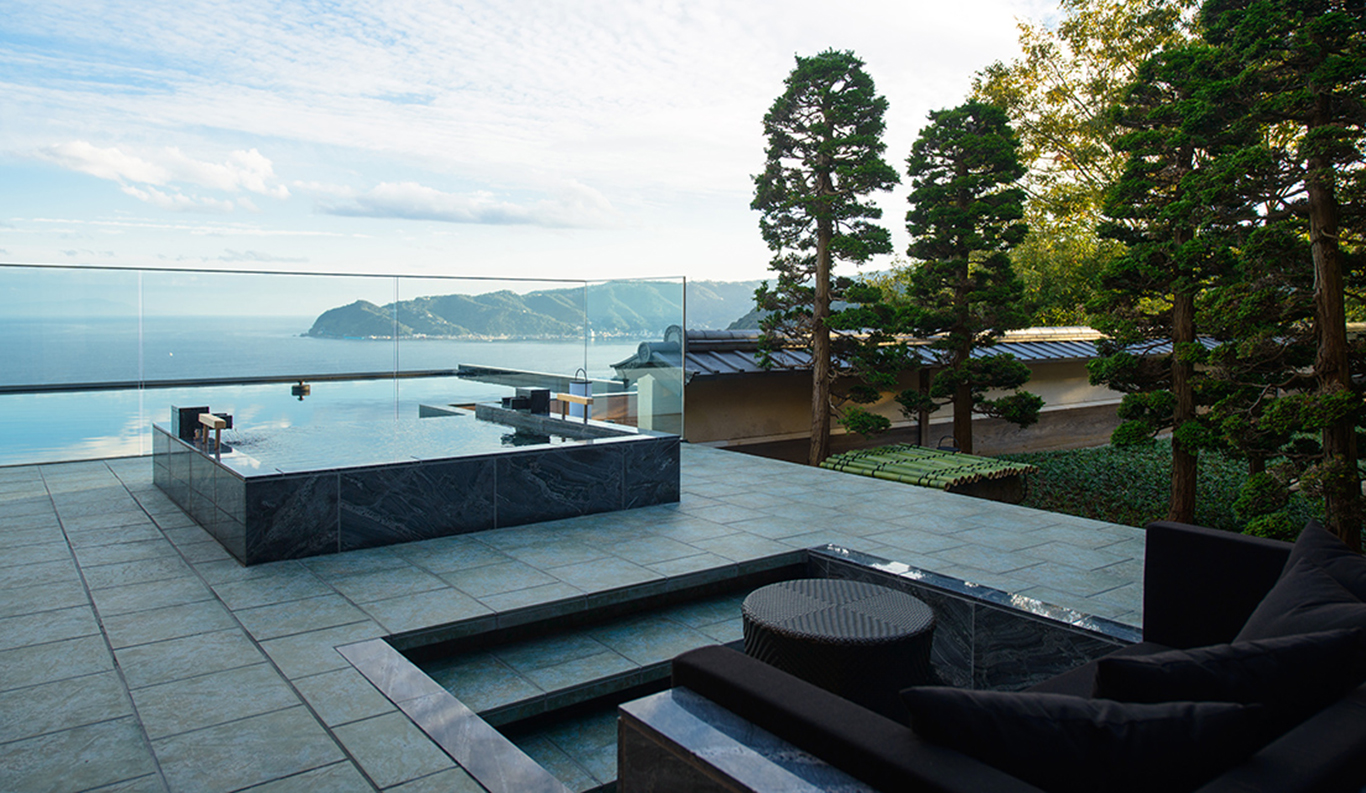 Premier Suite "Matsu," whose design is traditional Japanese-style, with shoji screens separating the rooms and fragrant tatami reed mats on the floors. Outside on their terraces are lovely big Rotemburo (Open-air hot spring) and comfy outdoor sofas, as well as pretty gardens and an infinity pool reflecting the gorgeous view. "Matsu" is named for the matsu Japanese black pine trees on its spacious 35 sq. meter veranda overlooking the bay. Its luxurious space and premium fittings are designed for the enjoyment of two guests.