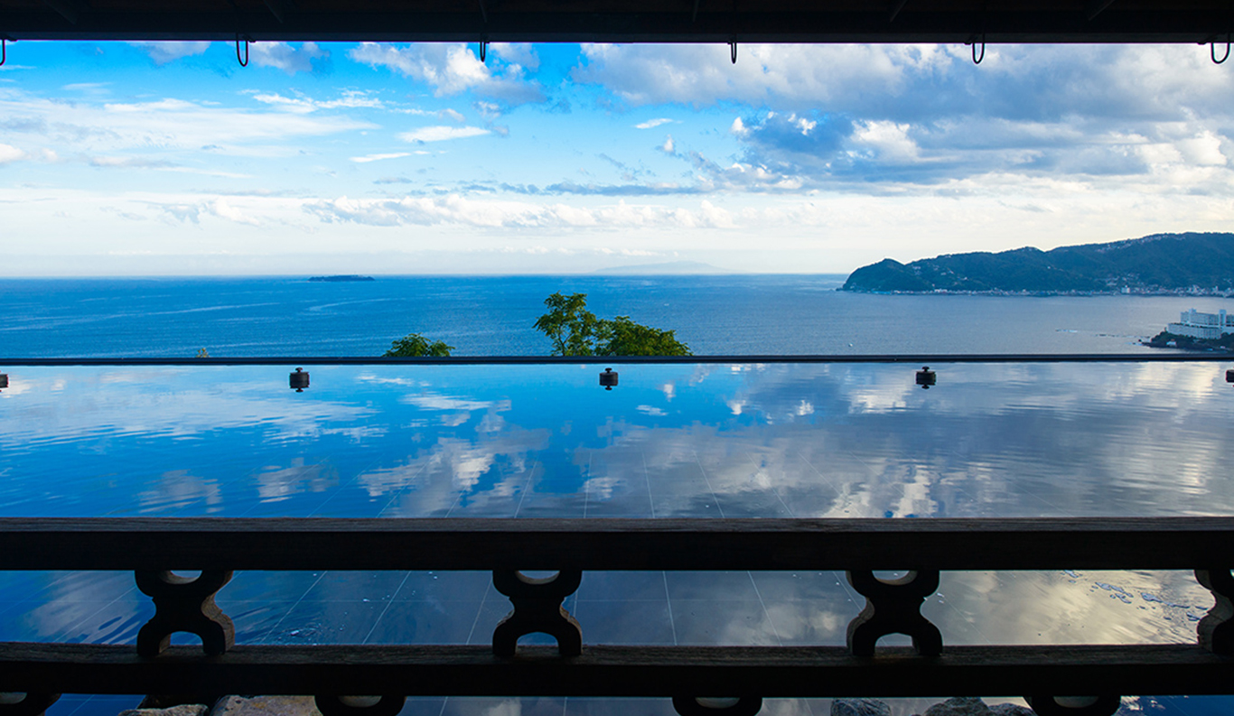 In the Entrance Lobby, arriving guests are greeted by a big, bold work of shodo calligraphy by Yuichi Inoue which expresses perfectly the experience to come – the Hiramatsu & Resorts Atami’s unique blend of modern dynamism and the ancient sensibility of traditional omotenashi hospitality. The ryokan’s Lounge boasts fine old woodwork and comfortable lounge chairs, as well as an outdoor terrace with comfortable lounge chairs and lovely views over Sagami Bay.