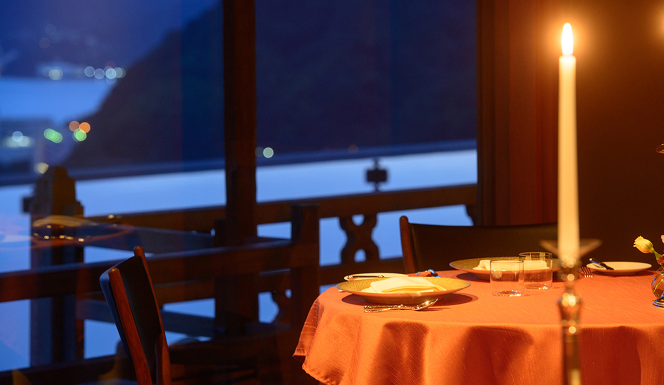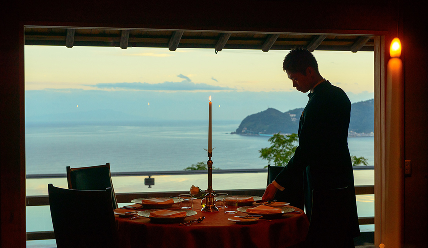The dining room is small and intimate, and the expert wait staffs are adept and attentive, helping to ensure an unsurpassed dining experience. In the evenings, torches provide a lovely warm light over the infinity pool outside, and during the day, the views over Sagami Bay are spectacular.
