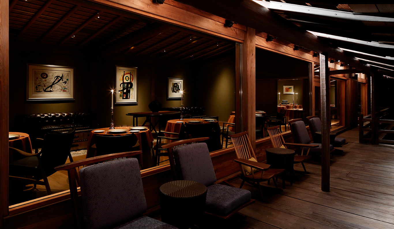 The building, with the simple, elegant lines of its Sukiya Zukuri traditional residential architecture, was refurbished, and some necessary modern touches added, but Morita left intact the lovely and warm interior wood, as well as the exterior, beautifully weathered by the salt and wind of its coastal location. Two additional floors were added, anchored solidly to the steep hillside overlooking Sagami Bay.