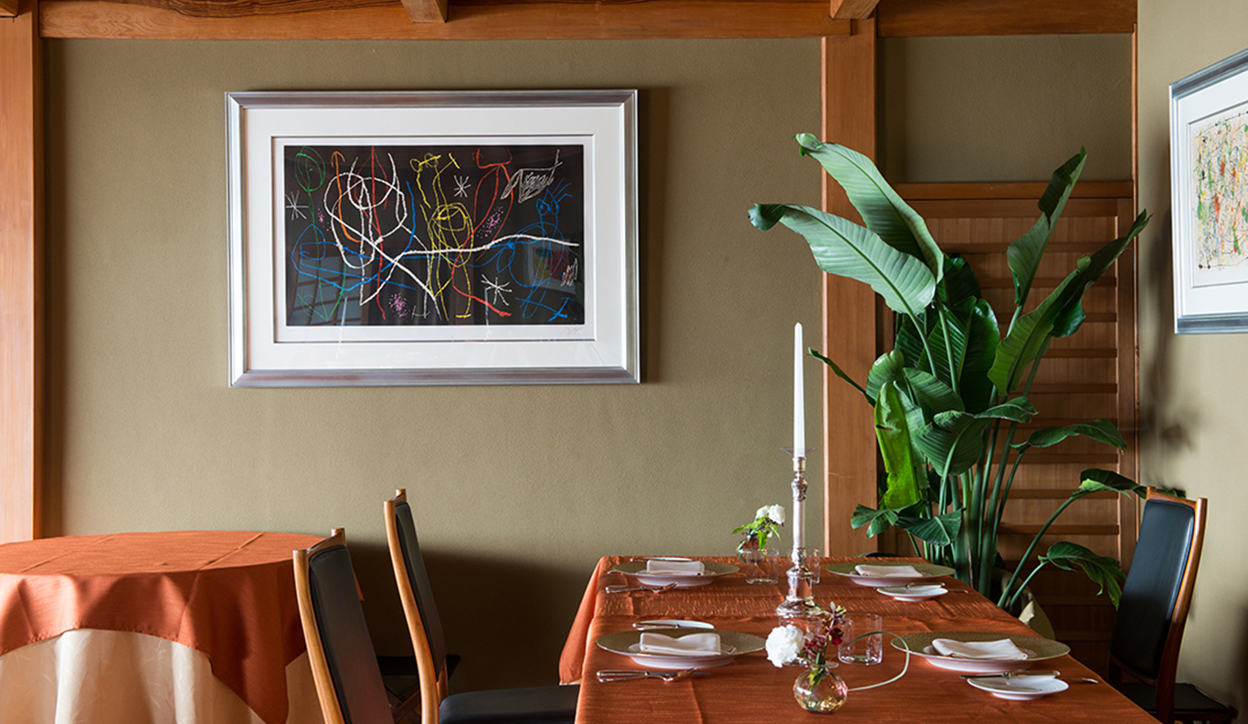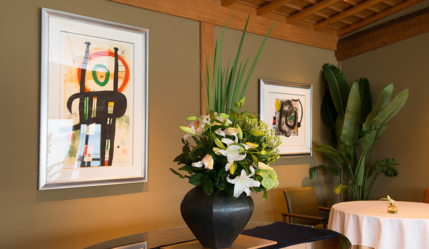 Everywhere in The Hiramatsu Hotels & Resorts Atami, both the art and the architecture express the fusion of East and West, Japanese and European – fantastic paintings by surrealist Joan Miro and landscape painter Tamako Kataoka grace many of the walls, and numerous works of shodo calligraphy by Yuichi Inoue provide both traditional sensibility and modern dynamism.