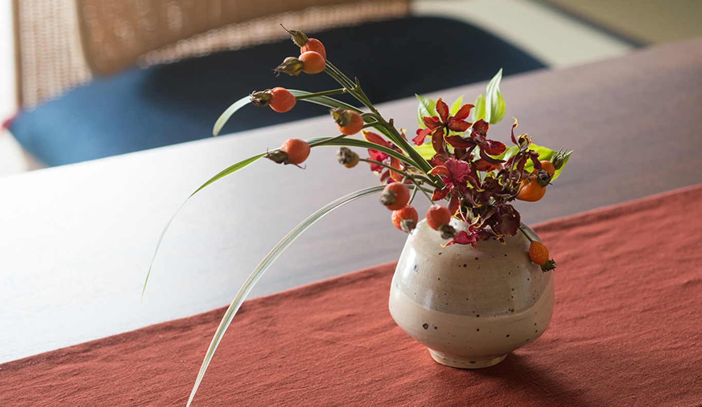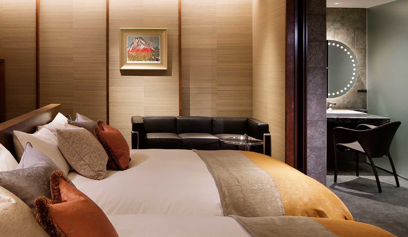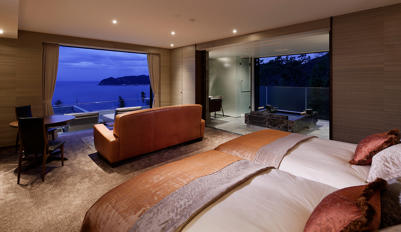 On one end of the first floor is a spacious corner suite, which can be arranged as a twin or a double. It has an anteroom, a sitting area with a couch, and a dining table. It also has a door connecting it to the Twin room next door, so that it can be enlarged to accommodate larger parties such as family gatherings.The rooms’ twin beds can be swapped out for doubles if the guest prefers. It has a hot spring bathtub inside the room and a terrace overlooking the beautiful Sagami bay, enabling guests to enjoy the well-known Atami Onsen whenever they like.