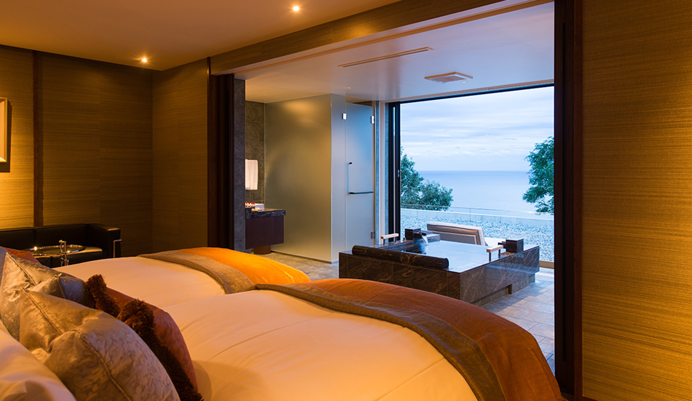 On the second floor, there are three twin rooms, equally luxurious as the ones below, and a bit more spacious at 77 sq. meters.The rooms’ twin beds can be swapped out for doubles if the guest prefers. A private hot spring is situated inside the room, overlooking the Sagami Bay, and enables guests to enjoy the well-known Atami Onsen whenever they like.