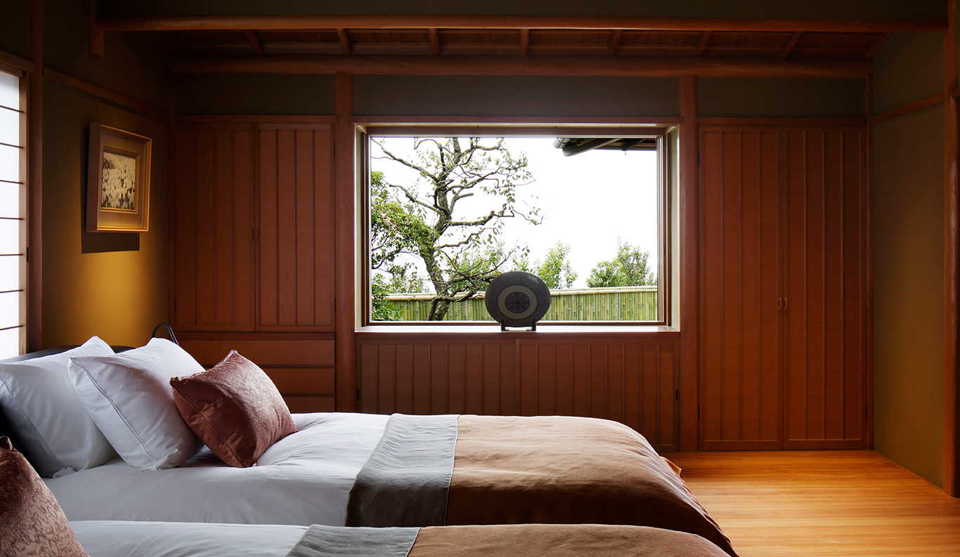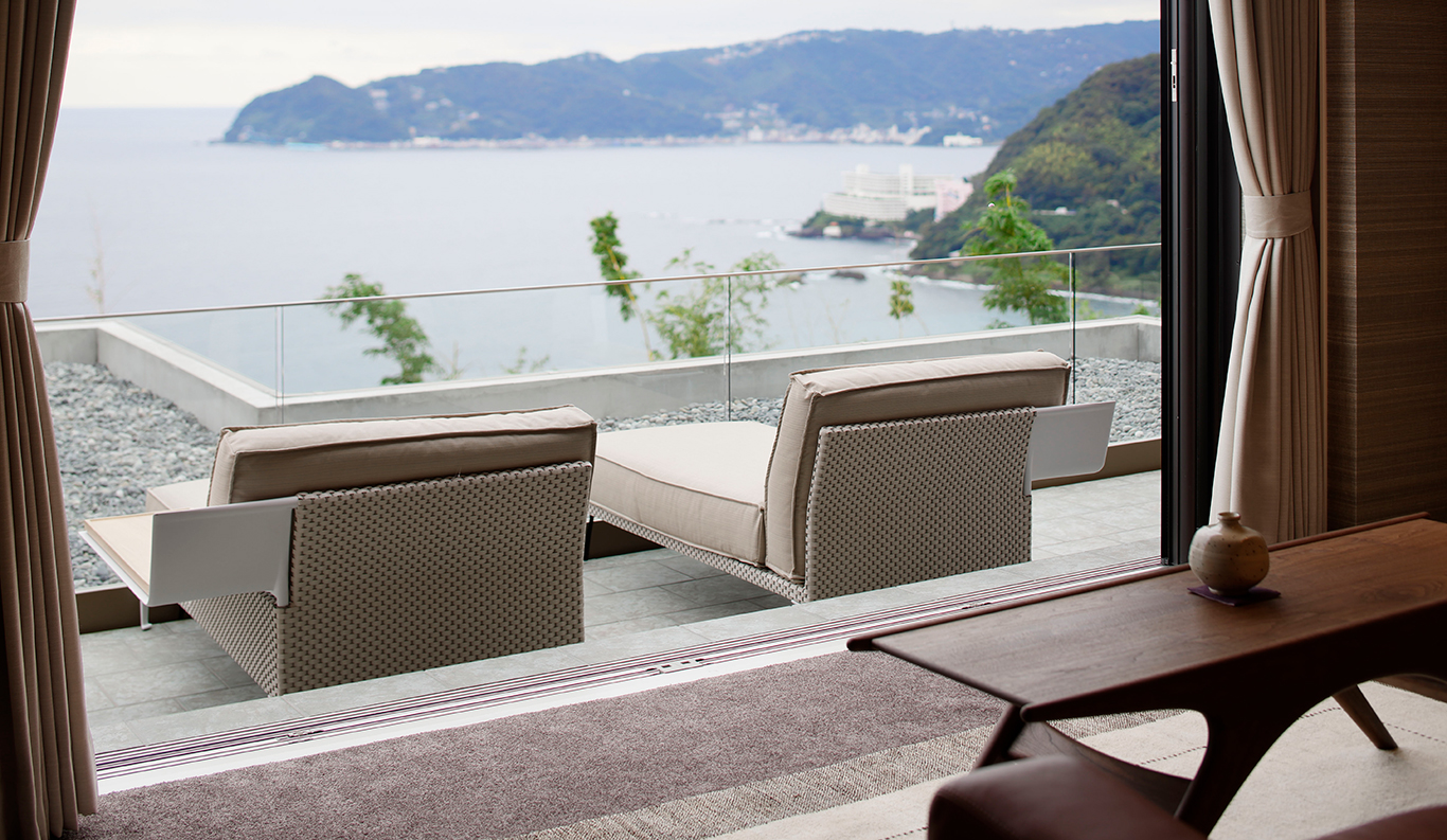 The Twins are at 61 sq. meters, and have a bigger veranda. The rooms’ twin beds can be swapped out for doubles if the guest prefers. It has a hot spring bathtub inside the room and a terrace overlooking a peaceful bamboo grove and beyond it to the sea, enabling guests to enjoy the well-known Atami Onsen whenever they like.
