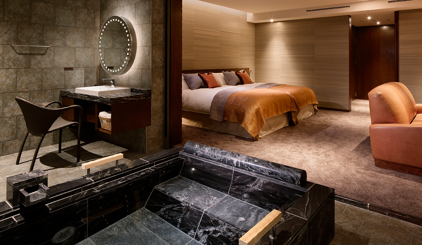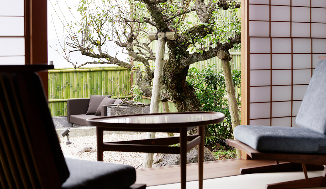 Premier Suite "Ume," whose design is traditional Japanese-style, with shoji screens separating the rooms and fragrant tatami reed mats on the floors. Outside on their terraces are lovely big Rotemburo (Open-air hot spring) and comfy outdoor sofas, as well as pretty gardens and an infinity pool reflecting the gorgeous view.