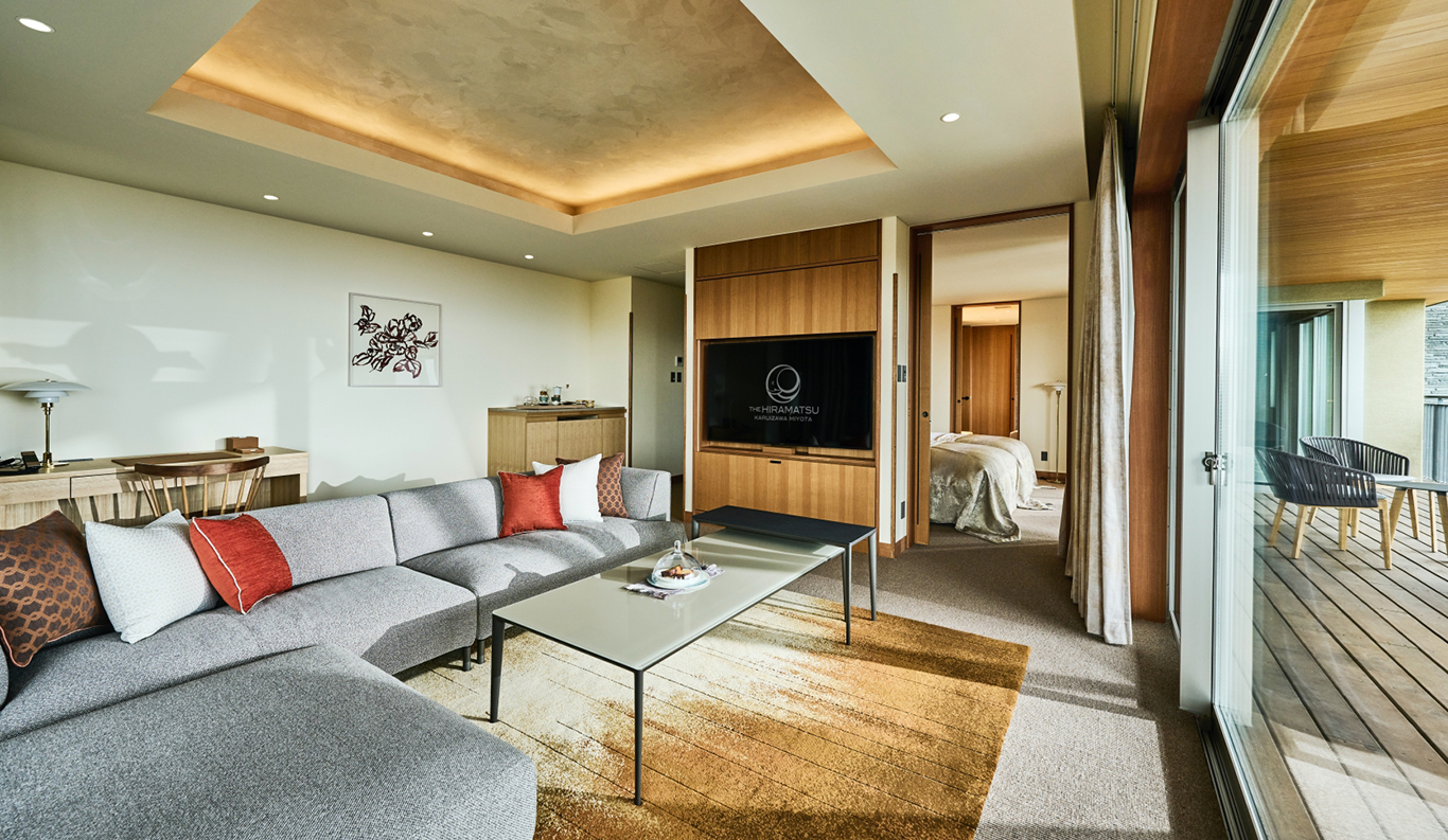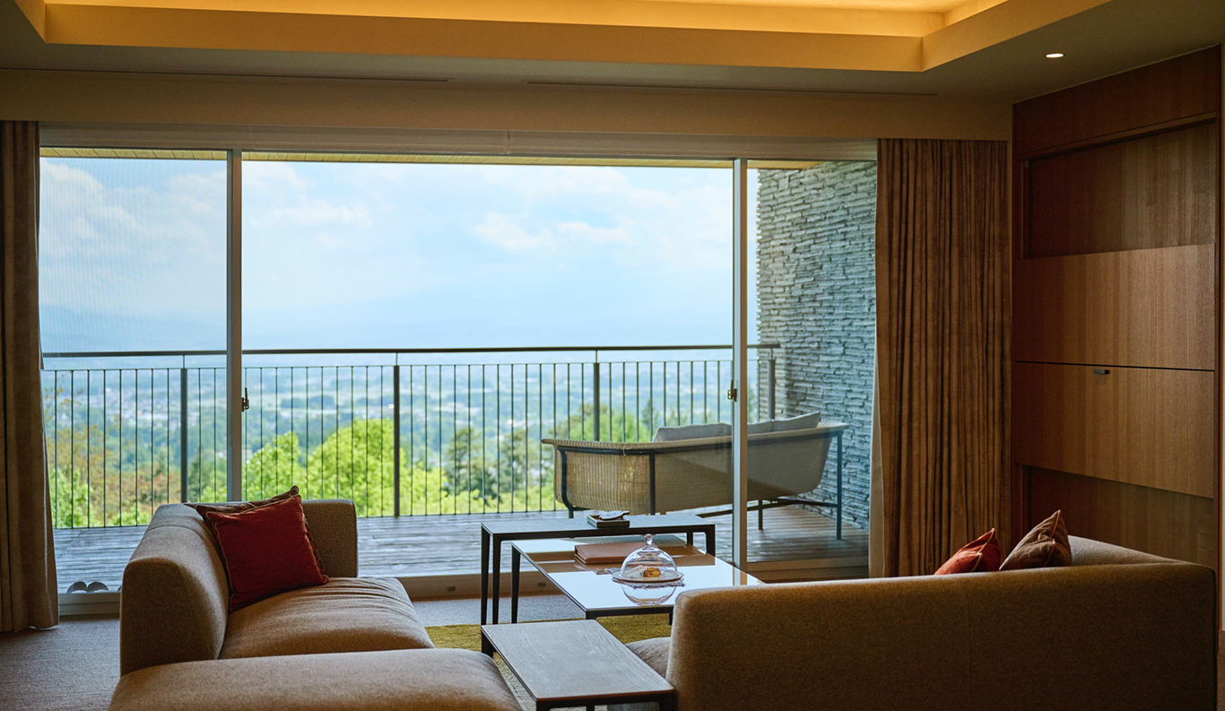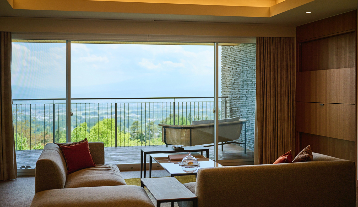 1-2 154 sqm Private Half Open-air Bath Bed The corner Junior Suites have wrap-around balconies with both sofas and armchairs, offering the perfect roost to lounge with a fresh-air coffee in the morning or a glass of wine at dusk. Indoors, overstuffed sectional sofas invite guests to stretch out and enjoy a movie on the cunningly concealed TV or to curl up with a book or loved one and just bask in the sun. In addition to coffee beans from a local roaster, fresh Shinsu fruit juices, and original organic amenities from plant biomethodology pioneer Waphyto, all rooms in the main building feature a semi-open air hot spring bath big enough for two, supplied with Hiramatsu’s signature hinoki cedar ribbon for an extra aromatic touch. The sky-view rooms are located on the third and fourth floors, while forest-view rooms are found on the first and second. ¥ 66,000~ per person (based on double occupancy) *Room rates at the Ryokan vary depending on the season and booking status. Therefore, we provide an estimated amount as a reference. REQUEST THIS ROOM -