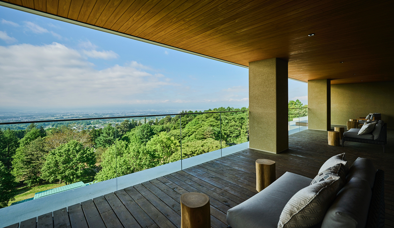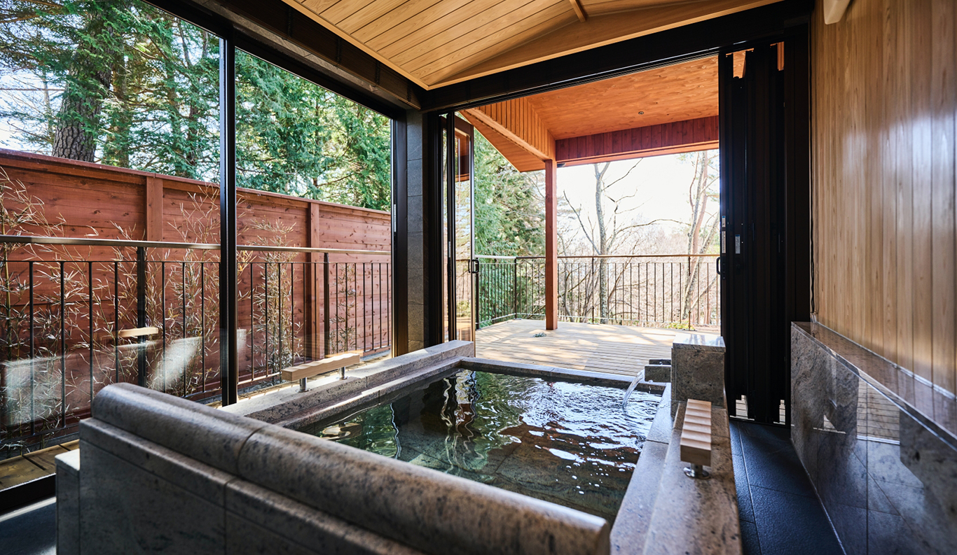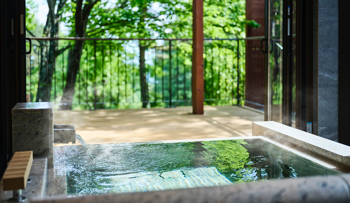 1-2 154 sqm Private Half Open-air Bath Bed The corner Junior Suites have wrap-around balconies with both sofas and armchairs, offering the perfect roost to lounge with a fresh-air coffee in the morning or a glass of wine at dusk. Indoors, overstuffed sectional sofas invite guests to stretch out and enjoy a movie on the cunningly concealed TV or to curl up with a book or loved one and just bask in the sun. In addition to coffee beans from a local roaster, fresh Shinsu fruit juices, and original organic amenities from plant biomethodology pioneer Waphyto, all rooms in the main building feature a semi-open air hot spring bath big enough for two, supplied with Hiramatsu’s signature hinoki cedar ribbon for an extra aromatic touch. The sky-view rooms are located on the third and fourth floors, while forest-view rooms are found on the first and second. ¥ 66,000~ per person (based on double occupancy) *Room rates at the Ryokan vary depending on the season and booking status. Therefore, we provide an estimated amount as a reference. REQUEST THIS ROOM -