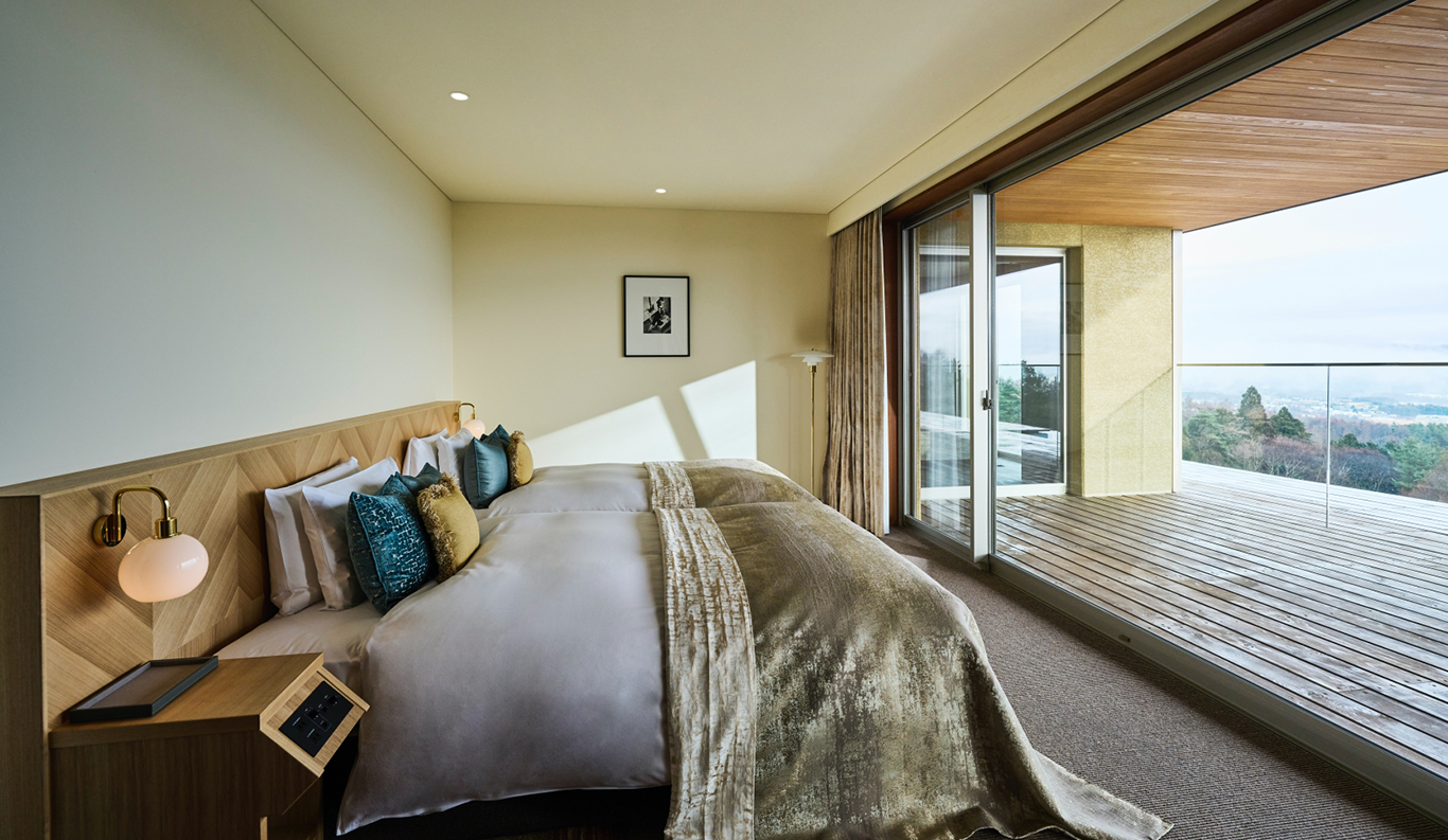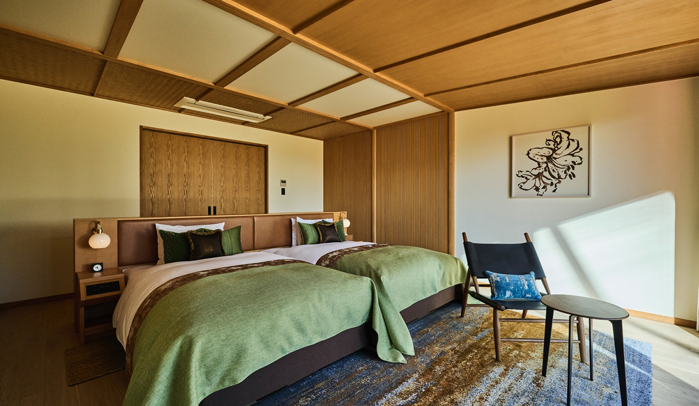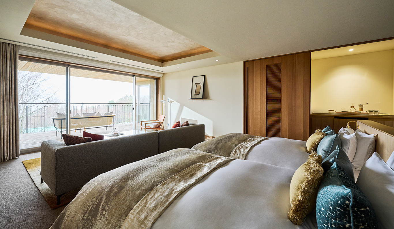 1-3 102 sqm Private Half Open-air Bath Bed The standard Deluxe Twin rooms all have slightly different layouts, but include a living space, work desk, balcony with sofa, and walk-in closets spacious enough for several large suitcases. All-natural materials like leather, wood, and thick weave fabrics create a tactile experience while the neutral shades leave the view in pride of place. In addition to coffee beans from a local roaster, fresh Shinshu fruit juices, and original organic amenities from plant biomethodology pioneer Waphyto, all rooms in the main building feature a semi-open air hot spring bath big enough for two, supplied with Hiramatsu’s signature hinoki cedar ribbon for an extra aromatic touch. The sky-view rooms are located on the third and fourth floors, while forest-view rooms are found on the first and second. ¥ 60,000~ per person (based on double occupancy) *Room rates at the Ryokan vary depending on the season and booking status. Therefore, we provide an estimated amount as a reference. REQUEST THIS ROOM -