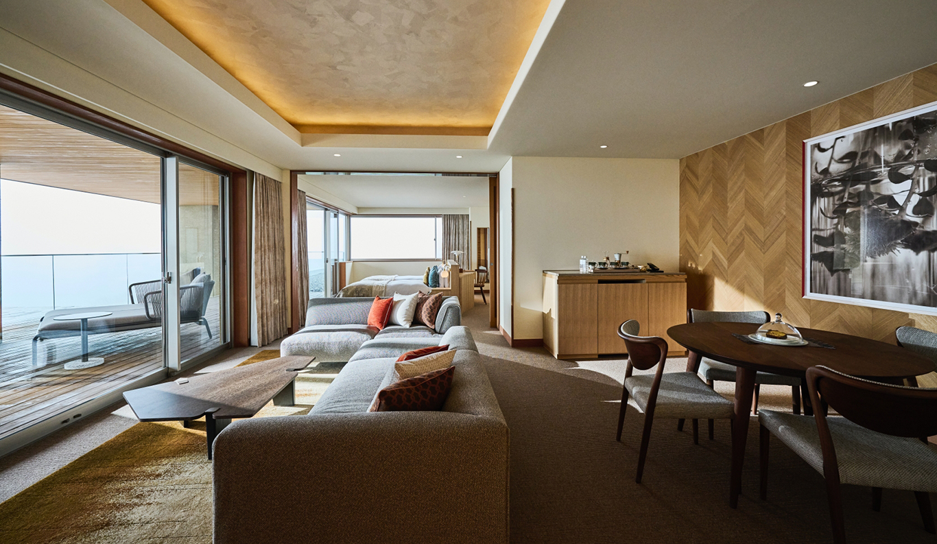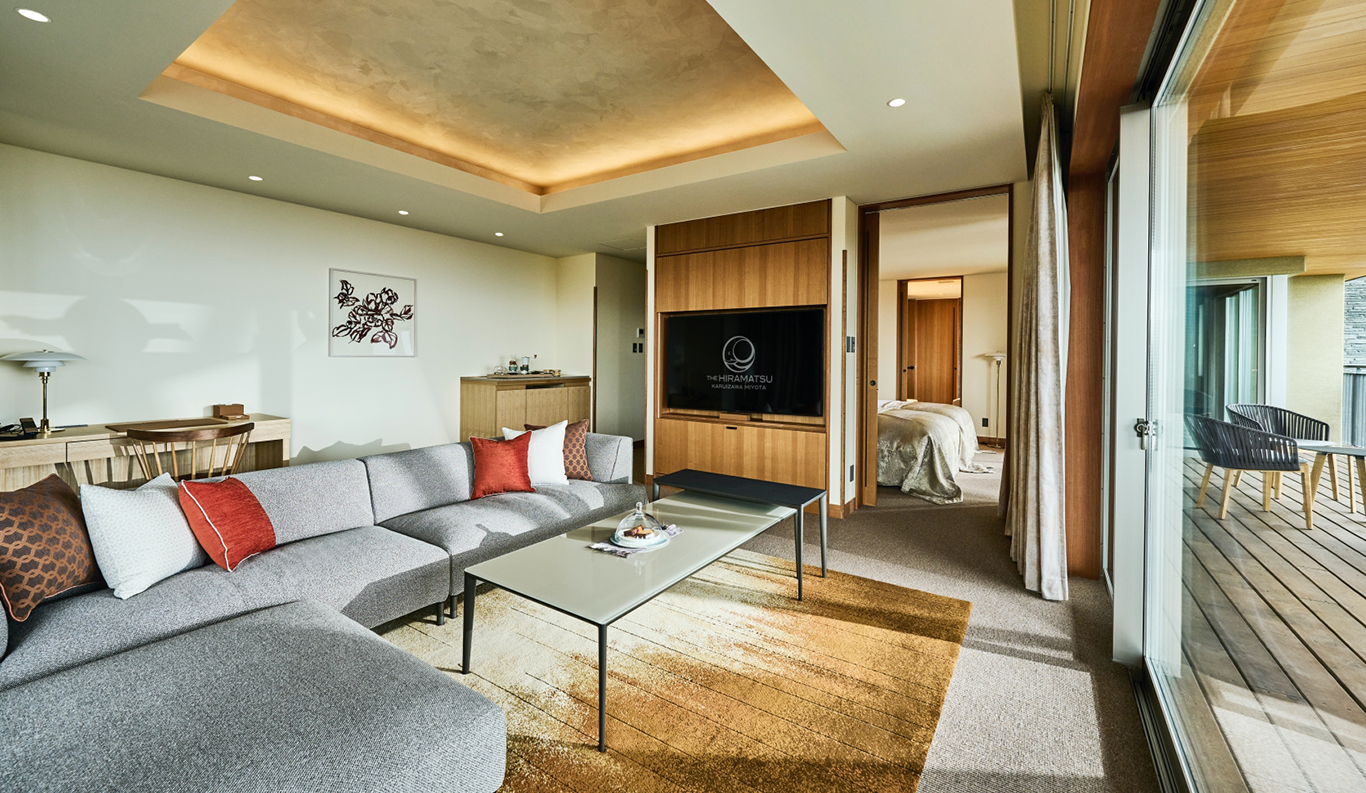 1-2 154 sqm Private Half Open-air Bath Bed The corner Junior Suites have wrap-around balconies with both sofas and armchairs, offering the perfect roost to lounge with a fresh-air coffee in the morning or a glass of wine at dusk. Indoors, overstuffed sectional sofas invite guests to stretch out and enjoy a movie on the cunningly concealed TV or to curl up with a book or loved one and just bask in the sun. In addition to coffee beans from a local roaster, fresh Shinsu fruit juices, and original organic amenities from plant biomethodology pioneer Waphyto, all rooms in the main building feature a semi-open air hot spring bath big enough for two, supplied with Hiramatsu’s signature hinoki cedar ribbon for an extra aromatic touch. The sky-view rooms are located on the third and fourth floors, while forest-view rooms are found on the first and second. ¥ 76,000~ per person (based on double occupancy) *Room rates at the Ryokan vary depending on the season and booking status. Therefore, we provide an estimated amount as a reference. REQUEST THIS ROOM -
