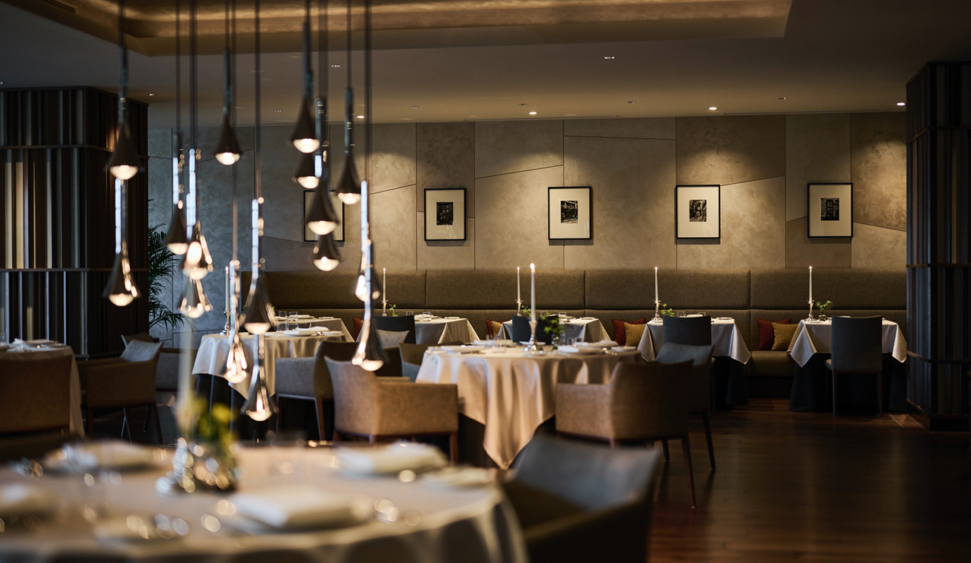 Le Grand Lys (Main Dining on 1F) Main dining room Le Grand Lys has a burbling spring lit by a silver drop light chandelier at its center, obliquely referencing the nourishing way terroir infuses the cuisine. The ambiance is classic European elegance, with Champagne iced in bowls of Cristofle silver, satiny white linens enlivened by the occasional pop of umber and yellow, and besuited waitstaff standing at the ready, but the 6-, 9-, and 10-course menus are an only-in-Nagano experience. Chef Yanagihara’s precise plating and classic preparations speak to his long experience in French kitchens, while the incredibly fresh ingredients and unexpected appearance of dashi and other stars of the washoku repertoire allow Japan’s distinctive umami to shine through for an unforgettable meal. Family friendly private rooms available.
