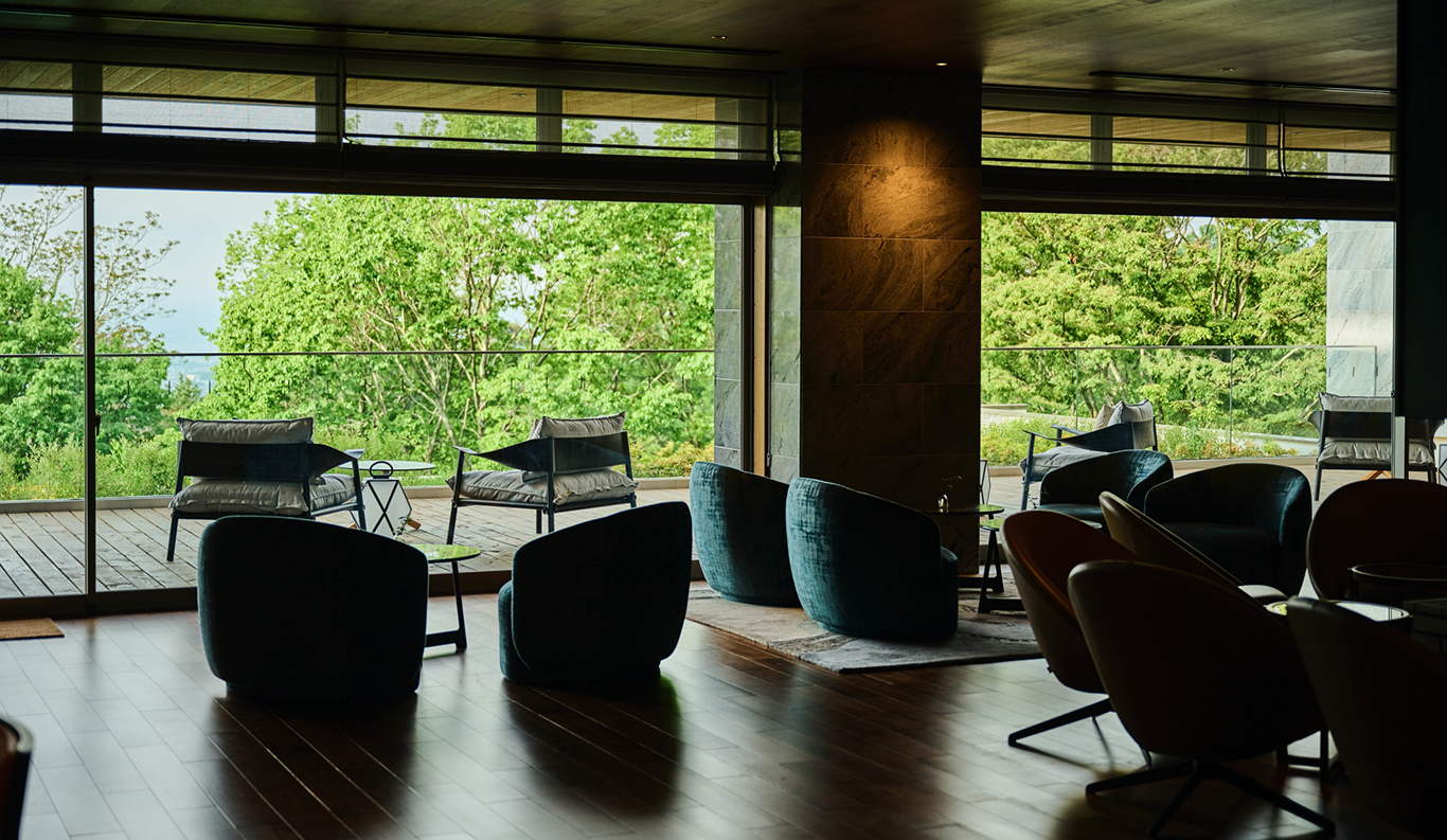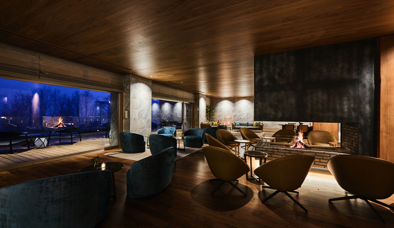 Lobby Lounge As the venue for check-in, the lounge immediately exudes a sense of welcome. The crackling fireplace at its heart entices guests to warm themselves by the flames on cold days, while the floor-to-ceiling views across the sleepy hamlet of Miyota to the Yatsugatake Mountains draws them out to the veranda in fine weather to better take in the view.