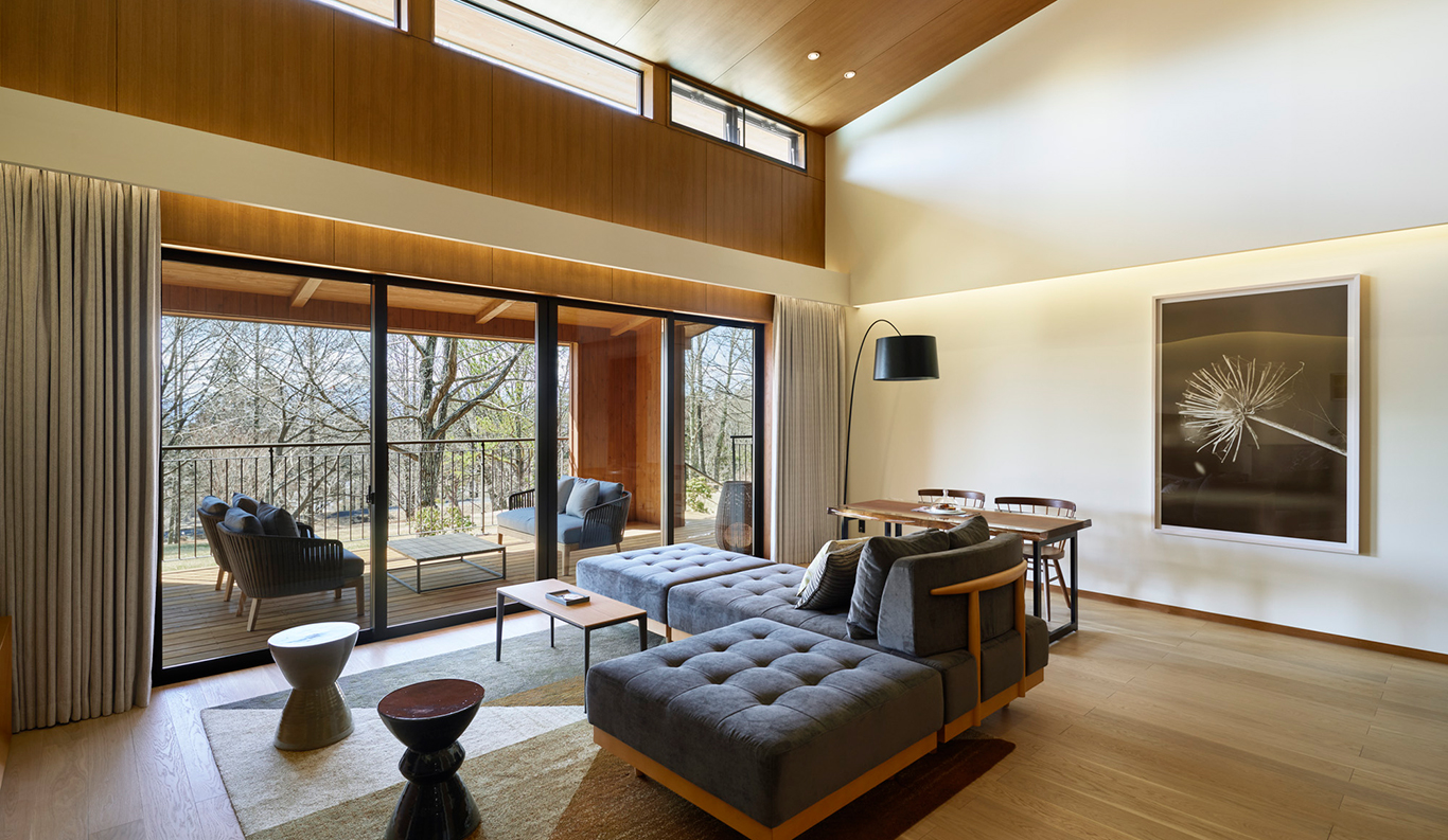 The 28 rooms and 9 villa suites all have spacious balconies or verandas, floor-to-ceiling windows, and semi-open air hot spring baths with mineral rich waters brought in from the famed onsen town of Ueda daily, ensuring guests can revel in the natural beauty of the mountain-side locale. Fireside lounges, a state-of-the-art sound library, and a spa round out the opportunities for relaxation, all adorned with an eclectic mix of art that spans prehistoric pottery shards to contemporary photography.