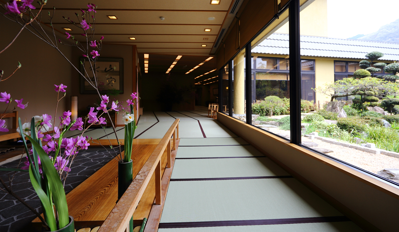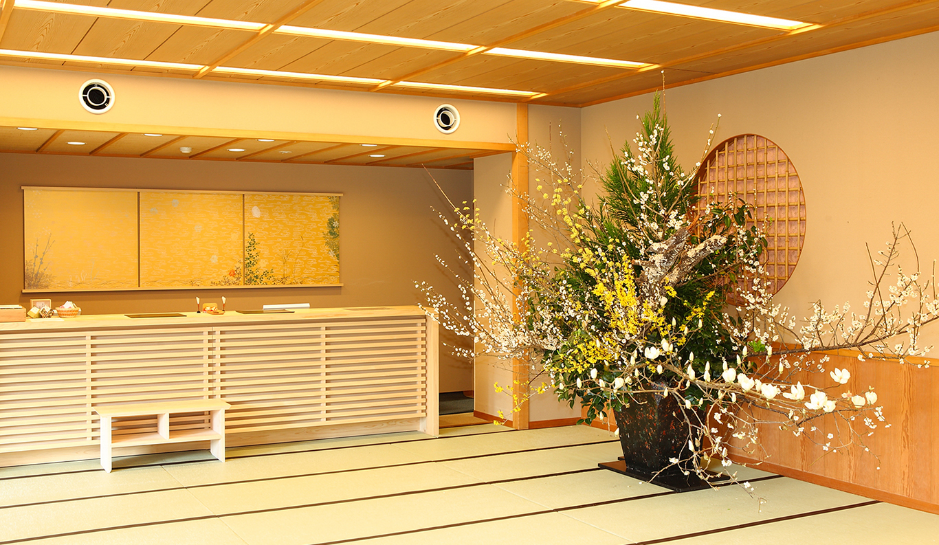 The ryokan displays all the luxury and refined taste one expects from a high-end establishment, including lovely interiors, impeccable service, relaxed, friendly hospitality, and exquisite attention to detail. The interior spaces, including the hallways, are carpeted with tatami, providing a restful aroma and enhancing the relaxed atmosphere. The interior design - down to the matchboxes - is meant to reflect the beauty of flowers and the passing of the seasons.