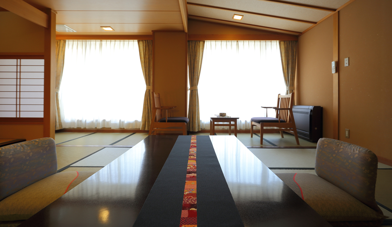 Semi-suites - These have twin Western-style beds with an attached tatami room for relaxing Japanese-style. The windows have lovely mountain views, and in-room meal service is available upon request for up to five diners. Children's discounts are available. Tall windows with shoji screens make these bright and cheerful rooms, with views of the mountainside across the way.