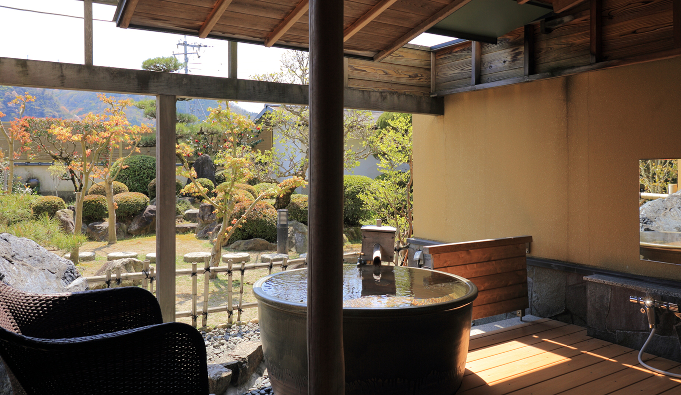 Kifu-no-sato's most popular suites are those with rotemburo open-air baths. Some of these are lovely Shigaraki yaki - huge and round, bathing in them is like soaking in a huge teacup. Others are big, square wooden tubs, equally comfortable. The ground-floor rotemburo suites have an attached garden; the top-floor ones are perfect for soaking and gazing at the stars. These rooms accommodate up to five guests.