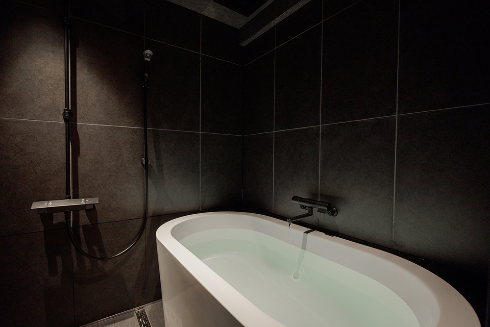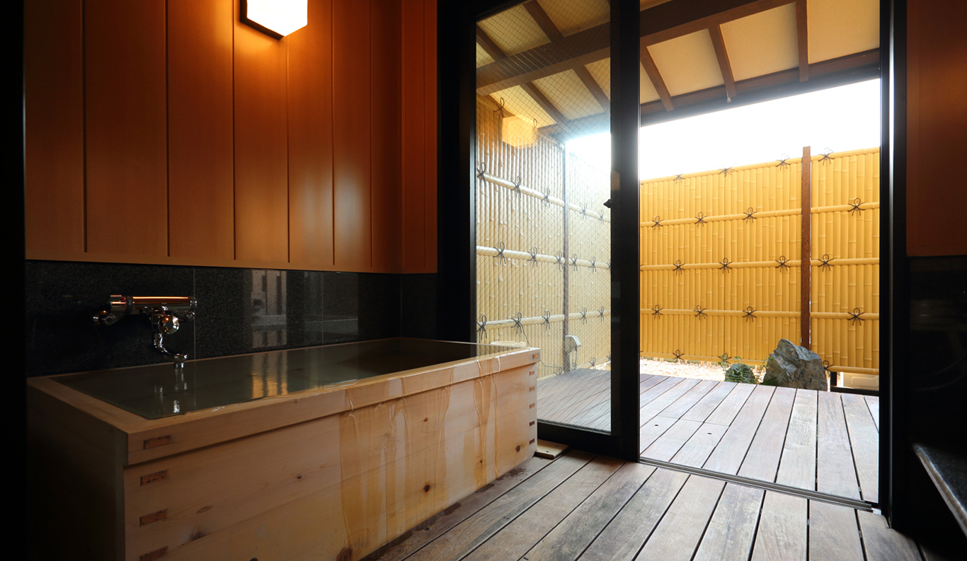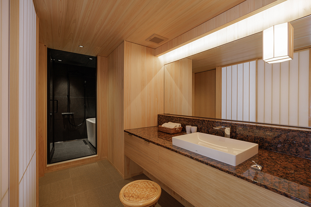 The guestroom was designed to look like a traditional deck attached to the house, on which you can enjoy the view of the Japanese garden with the Chugoku mountain range as its background. The bath in the suite was created with the guest’s ultimate comfort in mind. Though not an open-air bath in the traditional sense of the word, the window facing the garden can be opened, so regardless of the weather, the guest can enjoy the fresh air while taking a bath.