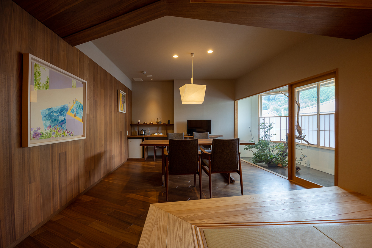 Kifu-no-sato's beautiful rooms all feature spaces with tatami mats, with their very restful aroma, and fine woodwork, including furniture made locally from sustainably harvested trees. Each room has different furnishings, locally made, which are available for purchase. Suites - These rooms have comfortable twin beds and an attached tatami room. There is fine woodwork throughout the rooms, including a large dining table made from light and silky Hinoki wood by a local craftsman. Interior details include Bizen-yaki pottery made by local artists and washi wall art, as well as huge flat-screen TVs. The suites include rotemburo outdoor bath, that is made of hinoki wood - soaking in a tub with the fragrance of hinoki wood will relax your body and soul.
